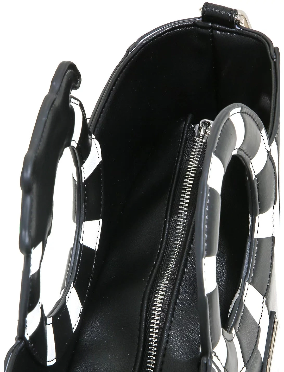 - This vegan leather cross body bag includes debossed, molded handle, removable/adjustable strap, interior lining and metal plaque details.