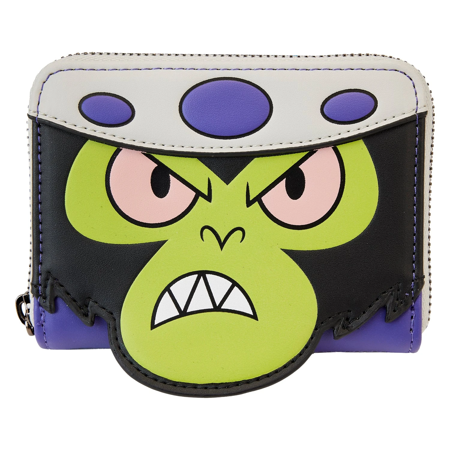 The Loungefly Powerpuff Girls Mojo Jojo Cosplay Zip Around Wallet is made of vegan leather (polyurethane). Wallet zips closed with shiny silver hardware. Additional features include applique, embroidered, glow-in-the-dark, and printed details. Take note of the coordinating inside lining.
