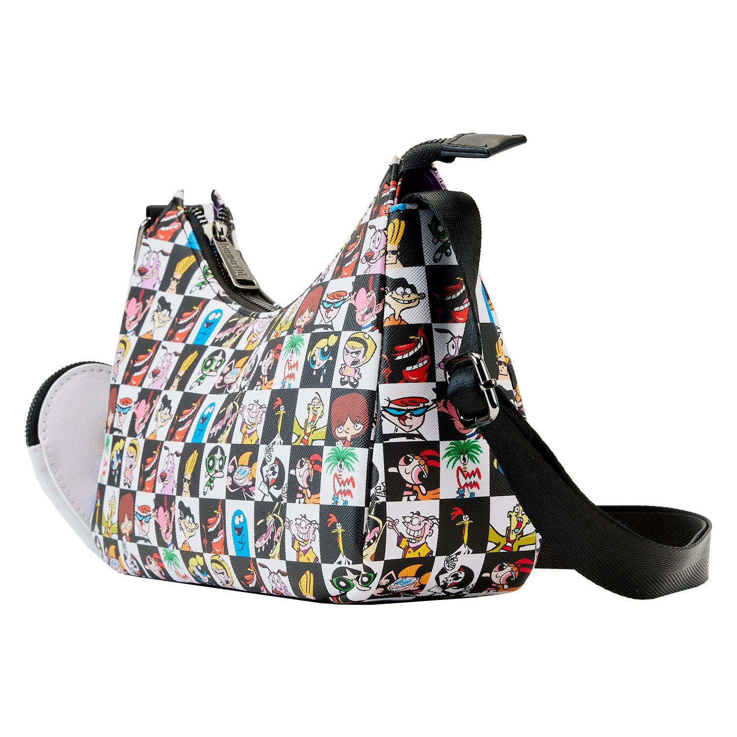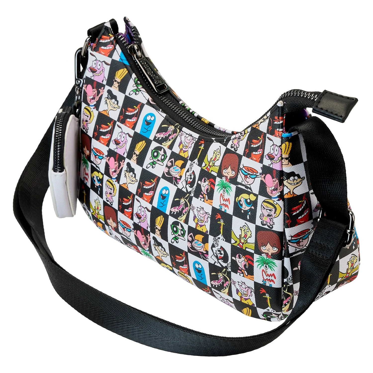 This is Cartoon Network! Your favorite after-school pals are jumping off the screen to join the Loungefly Cartoon Network Retro Collage Crossbody Bag with Coin Pouch. In this black-and-white checkerboard design, you’ll find beloved characters from shows such as The Powerpuff Girls, Ed, Edd, n Eddy, Dexter’s Laboratory, Foster’s Home for Imaginary Friends, , Cow and Chicken, Johnny Bravo, and Courage the Cowardly Dog. Up above, a detachable heart-shaped coin pouch shows Blossom, Bubbles, and Buttercup near the bag’s shoulder strap. A trendy throwback for any wardrobe, this animated accessory is perfect for kids of all ages.