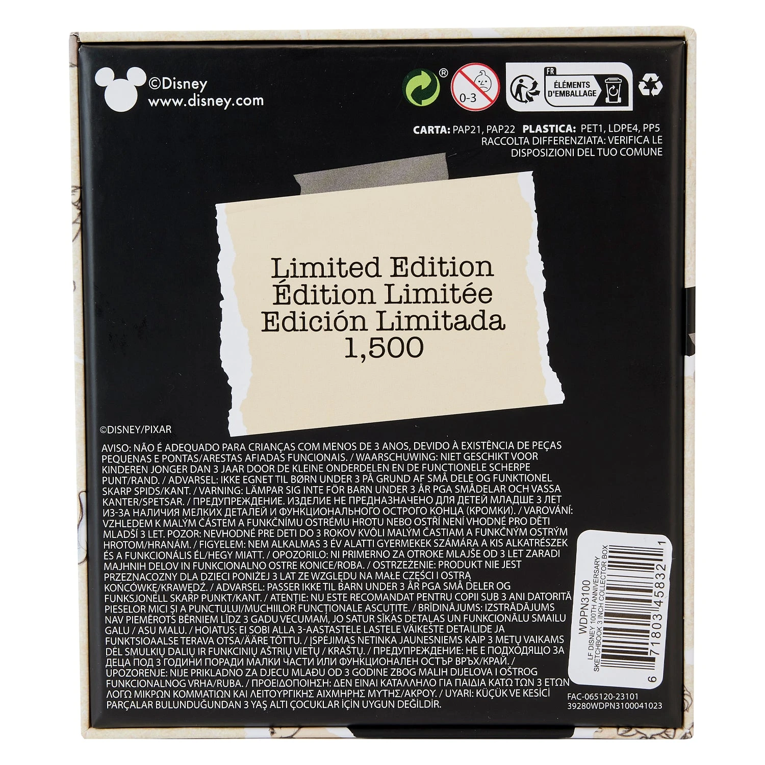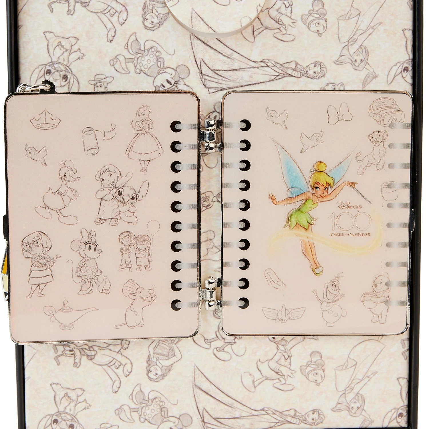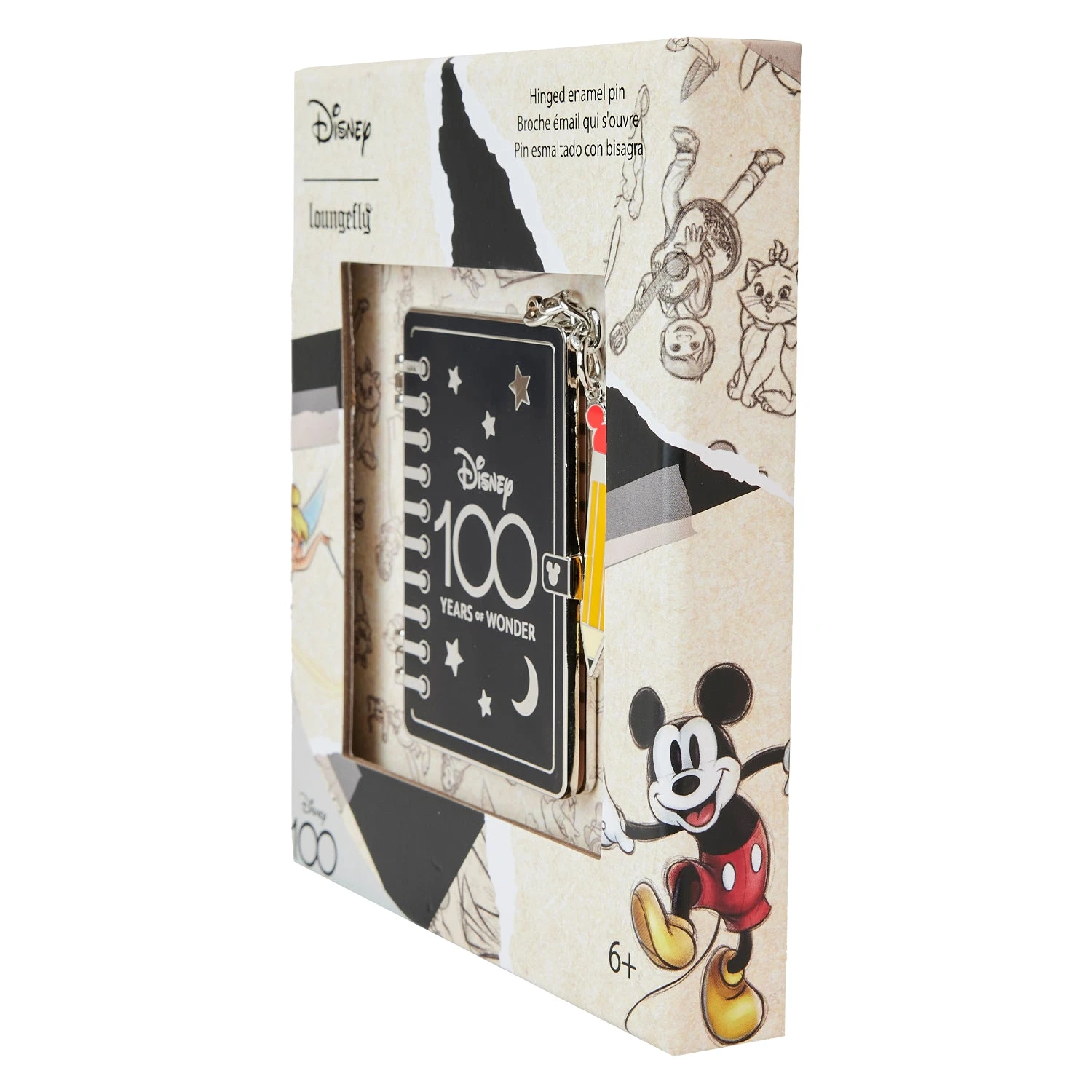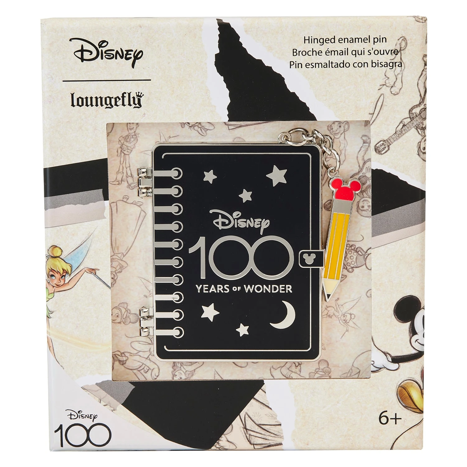 Draw a crowd to your pin collection with our Loungefly Disney100 Sketchbook 3-Inch Collector Box Pin. The entire pin takes the shape of a spiral-bound sketchbook, and it opens on a hinge with a metal clasp accentuated by Mickey’s head and ears in silver. The front cover, which features silver stars and moons, displays the Disney 100 Years of Wonder slogan. When you open the front cover, you’ll find illustrations and sketches of beloved Disney characters, and Disney’s Tinker Bell makes a full-color appearance, waving her Pixie Dust over the Disney100 logo. An enamel charm of a pencil, with Mickey’s signature ears at the top, finishes off the look. Take note and celebrate Disney100 with a page-turning pin for your collection.
