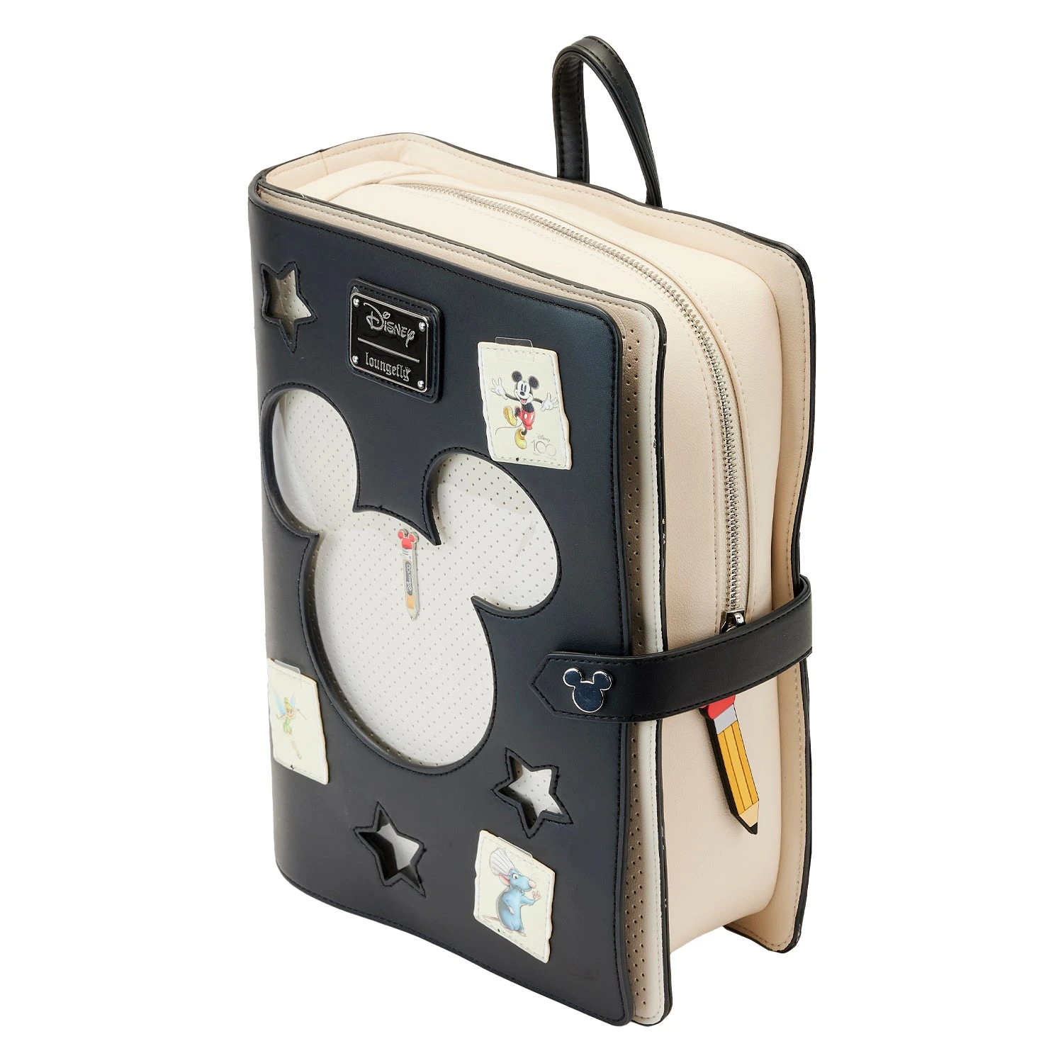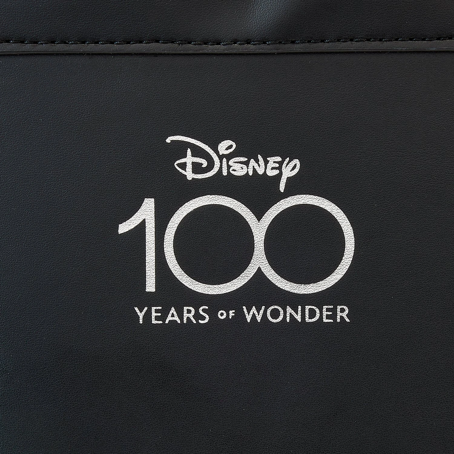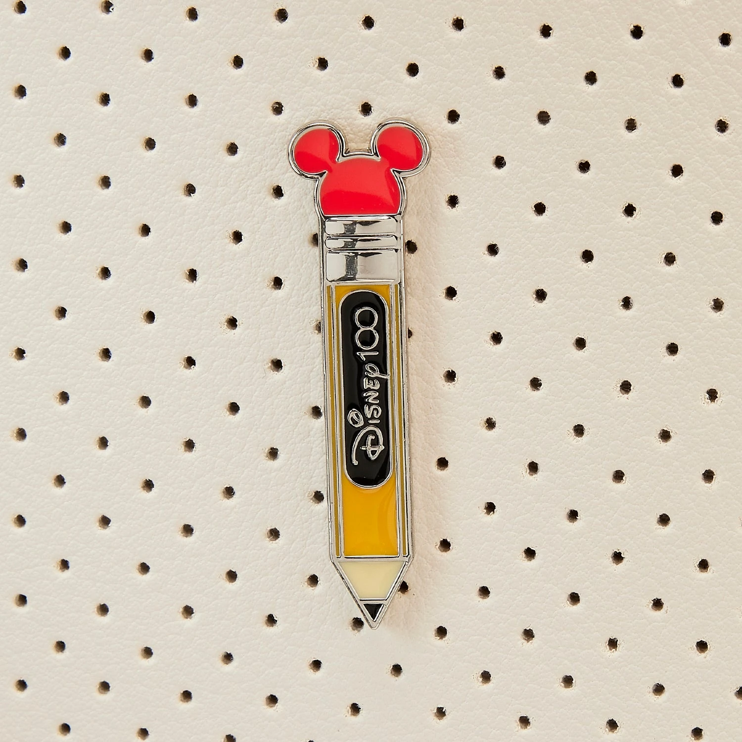 Draw a crowd with our Loungefly Disney100 Sketchbook Pin Trader Backpack. This special-edition “Sketchbook” line features a spiral-bound notebook look with starring appearances by Mickey Mouse and a few more memorable characters. On the front of the sleek black “cover,” you’ll find a die-cut shape of Mickey Mouse, and a perforated panel, behind the front flap, allows you to display your pin collection. A silver-colored metal snap of Mickey’s face and ears helps close the front and back of the bag. Printed appliques of Mickey and other characters are secured to the front cover with PVC “clear tape” for an extra-fun touch. An enamel pin of a pencil, featuring the Disney100 logo and Mickey’s ears and head as an “eraser,” comes with the bag. A silicone-molded pencil zip pull finishes the look. On the back, you’ll find the signature Disney100 logo. Take note and celebrate Disney100 in page-turning style.