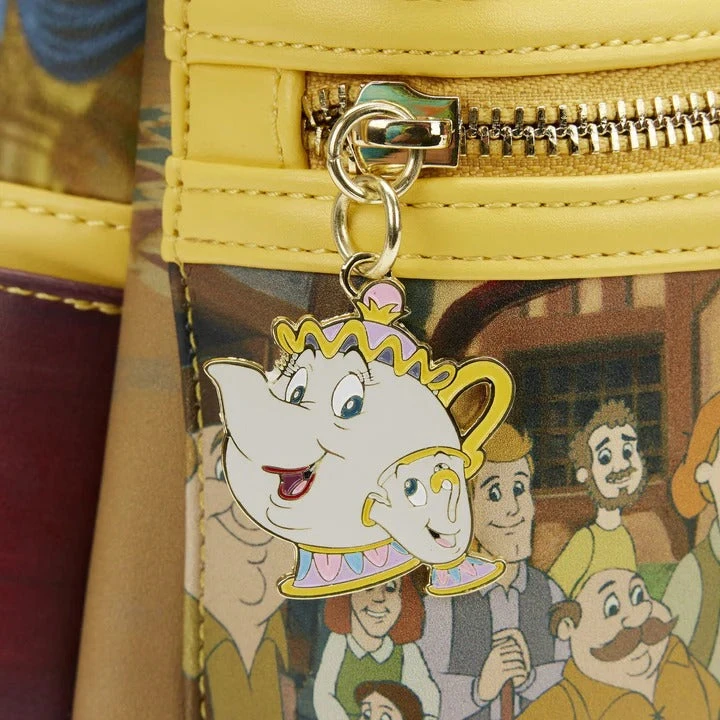 An enchanting journey awaits you with this Loungefly Disney Beauty and the Beast Belle Princess Scenes Mini Backpack. Your invitation has arrived, and you have front-row seats to witness Belle’s story as it plays out on this backpack. Through stunning, original in-house art, scenes from Beauty and the Beast unfold on all sides! On the front zipped compartment, Belle enters the town, book in hand, while curious bystanders look on. Above this scene, Belle and the Beast dance in the ballroom. The side pockets include precious interactions between Chip and Mrs. Potts and Lumiere and Cogsworth. On the back, Gaston admires his reflection in the mirror. An enamel zipper charm of Mrs. Potts pulls the scenes together. It’s the perfect accessory for complementing a Disney outfit or turning everyday travels into enchanting adventures.