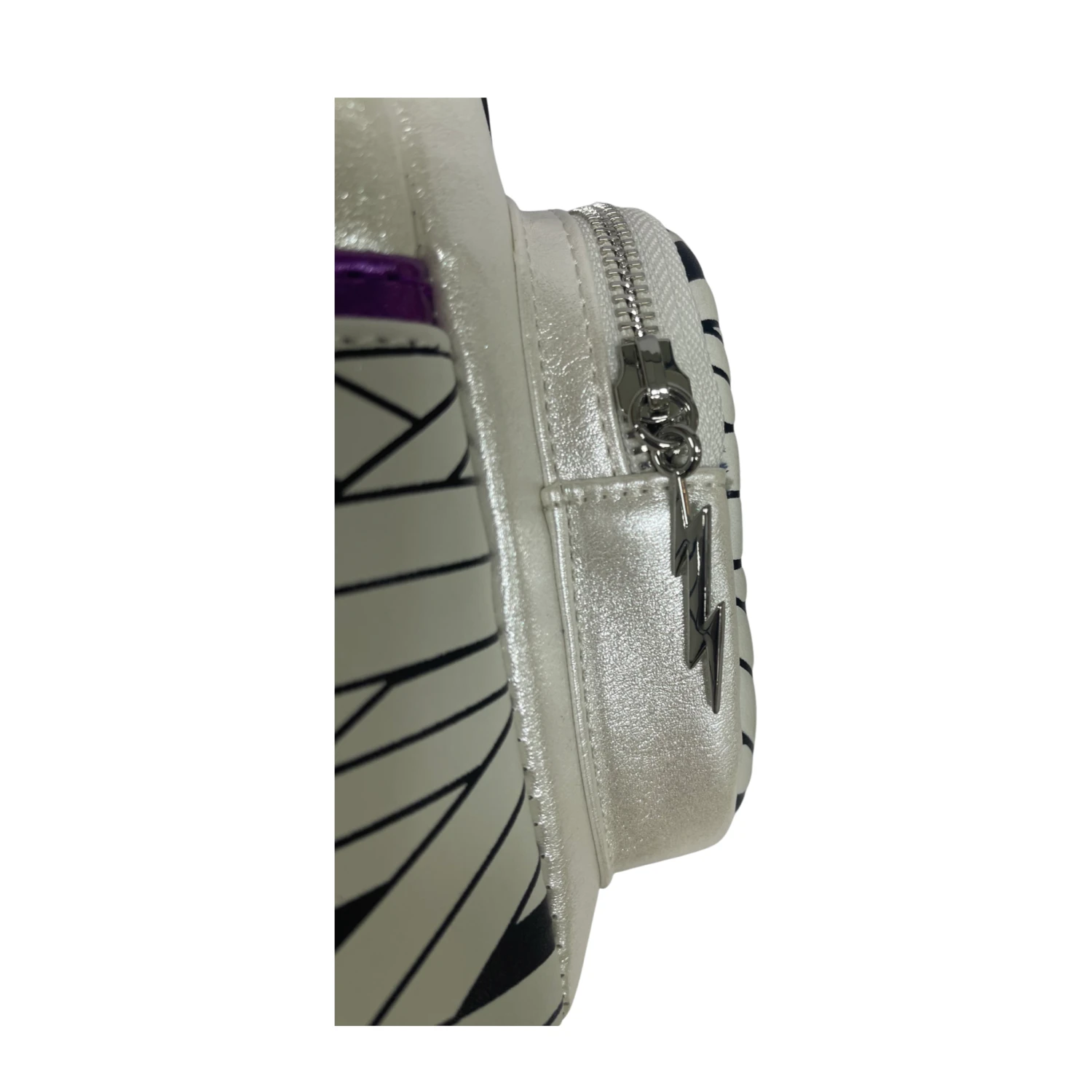 She’s Alive… Our Loungefly Disney Bride of Frankenstein Mini Backpack is a boooo-tiful pearlescent shimmer Faux leather mini backpack. Her bow has the iconic lightning streaks as well as a lightning bolt zipper charm. She has lots of glow and beautiful metallic purple trim and padded straps. Fun printed matching AOP lining. She has a inside zip pocket and there are also sided pockets.