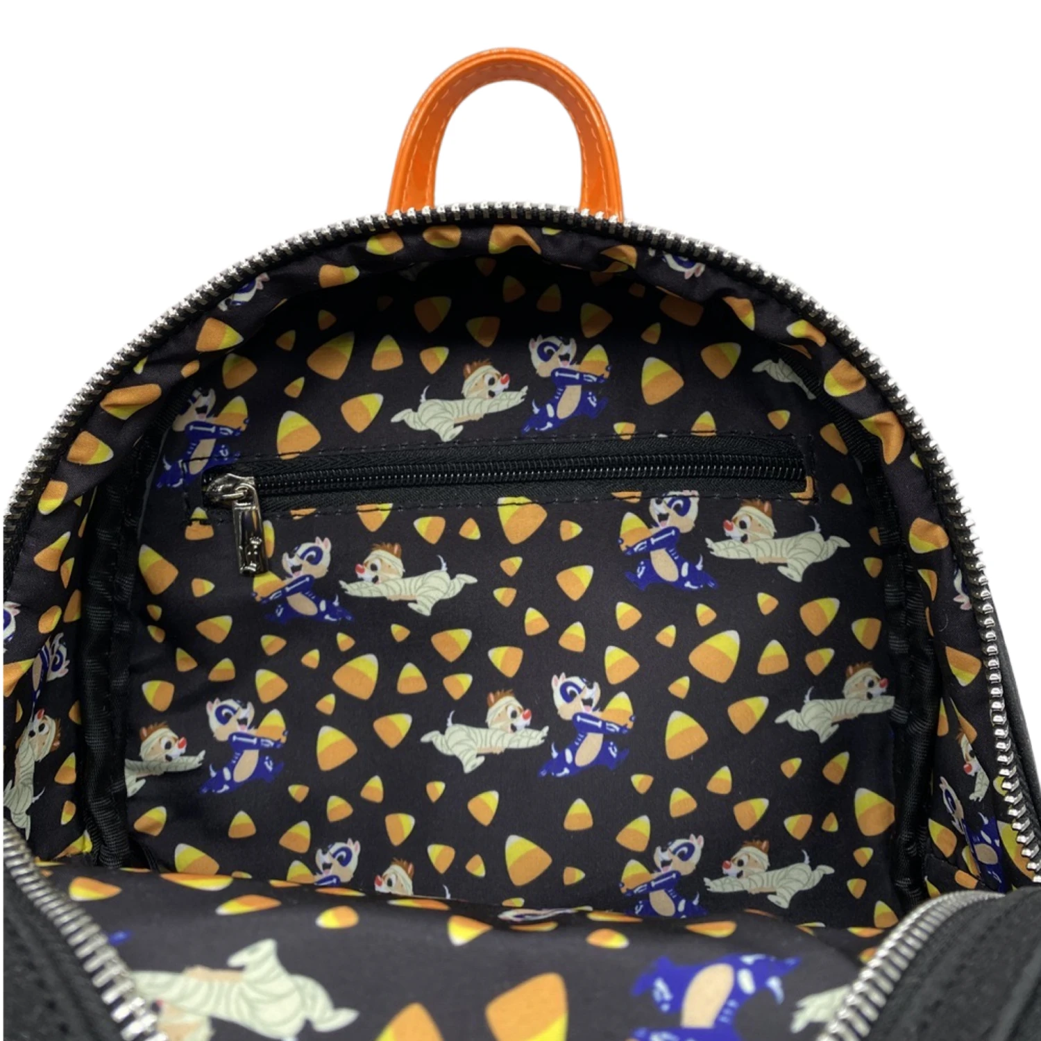 Trick or Treat in style with our newest Loungefly Exclusive! Chip n Dale are in their Halloween costumes with a mountain of candy corn and an iridescent Pumpkin Mickey front pocket that all glows in the dark! Fun matching printed AOP lining. There are side pockets, a cute printed back hit and there are 3 enamel filled zipper pulls. Shiny silver hardware, padded straps and metal plaque.