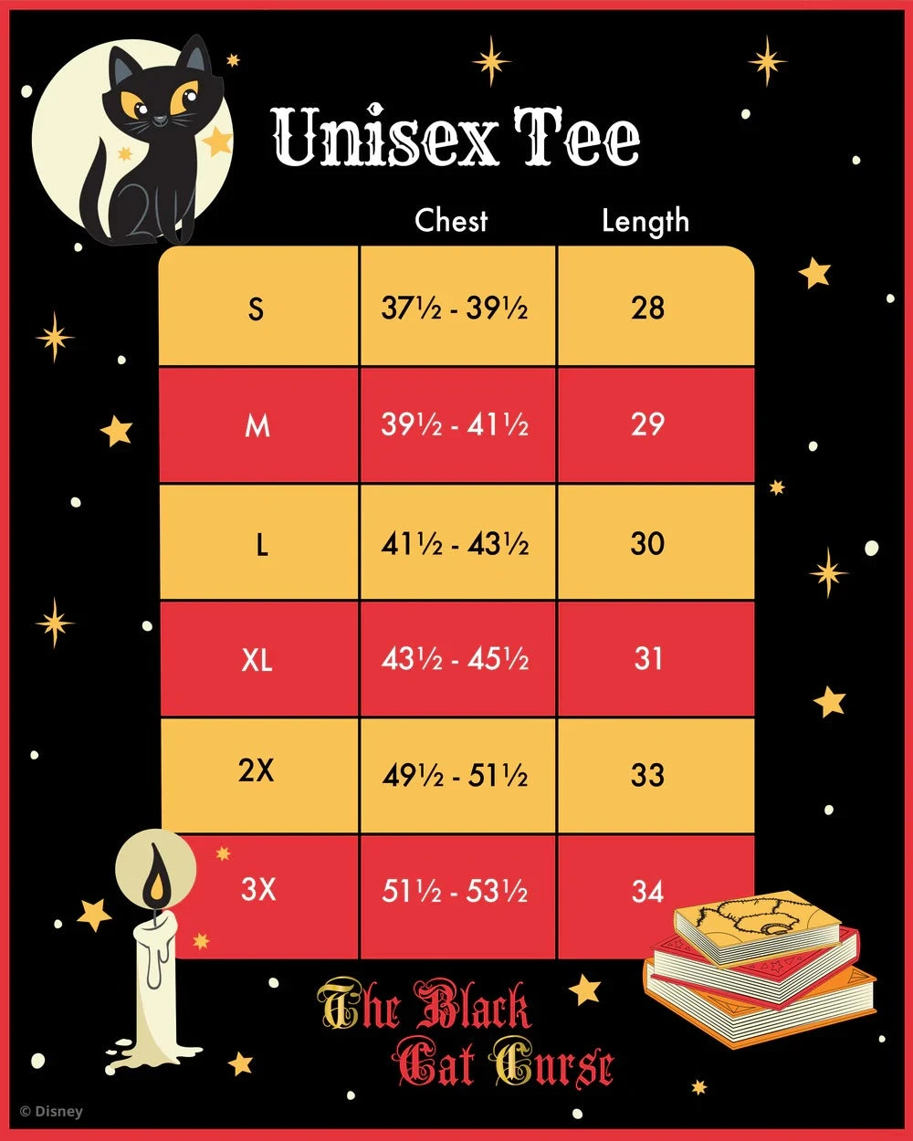 Invoke the power of the Sanderson Sisters with the Loungefly Hocus Pocus Binx Curse Tee. This super soft tee shirt outlines the Black Cat Curse that was used to transform Thackery Binx into his cat form. Written in a script inspired by the Sanderson Sisters’ spell book, the shirt reads: “Twist the bones and break the back. Ichita Copita Melaka Mystika, Trim him of his baby fat. Itchita Copita Melaka Mystica, Give him fur black as black. Just… Like… This.”