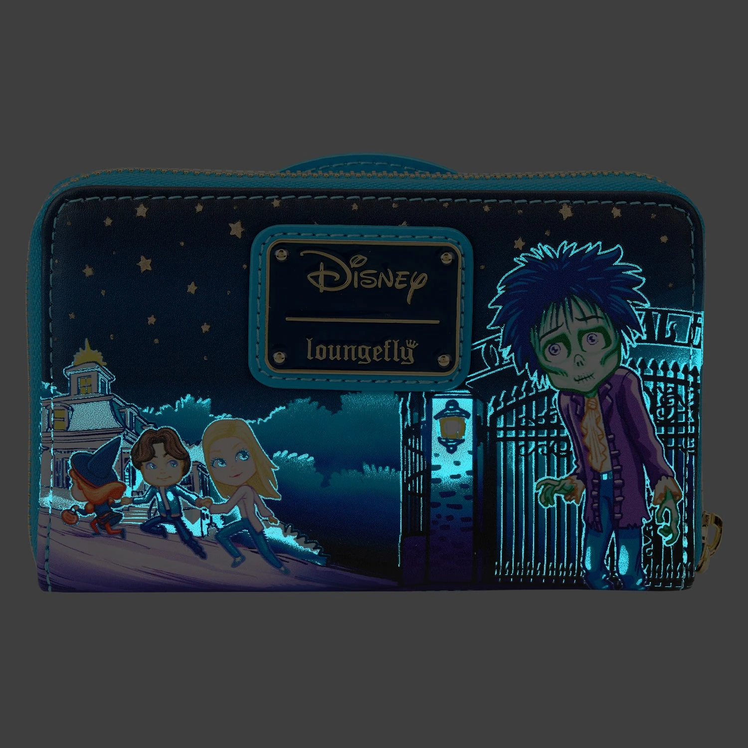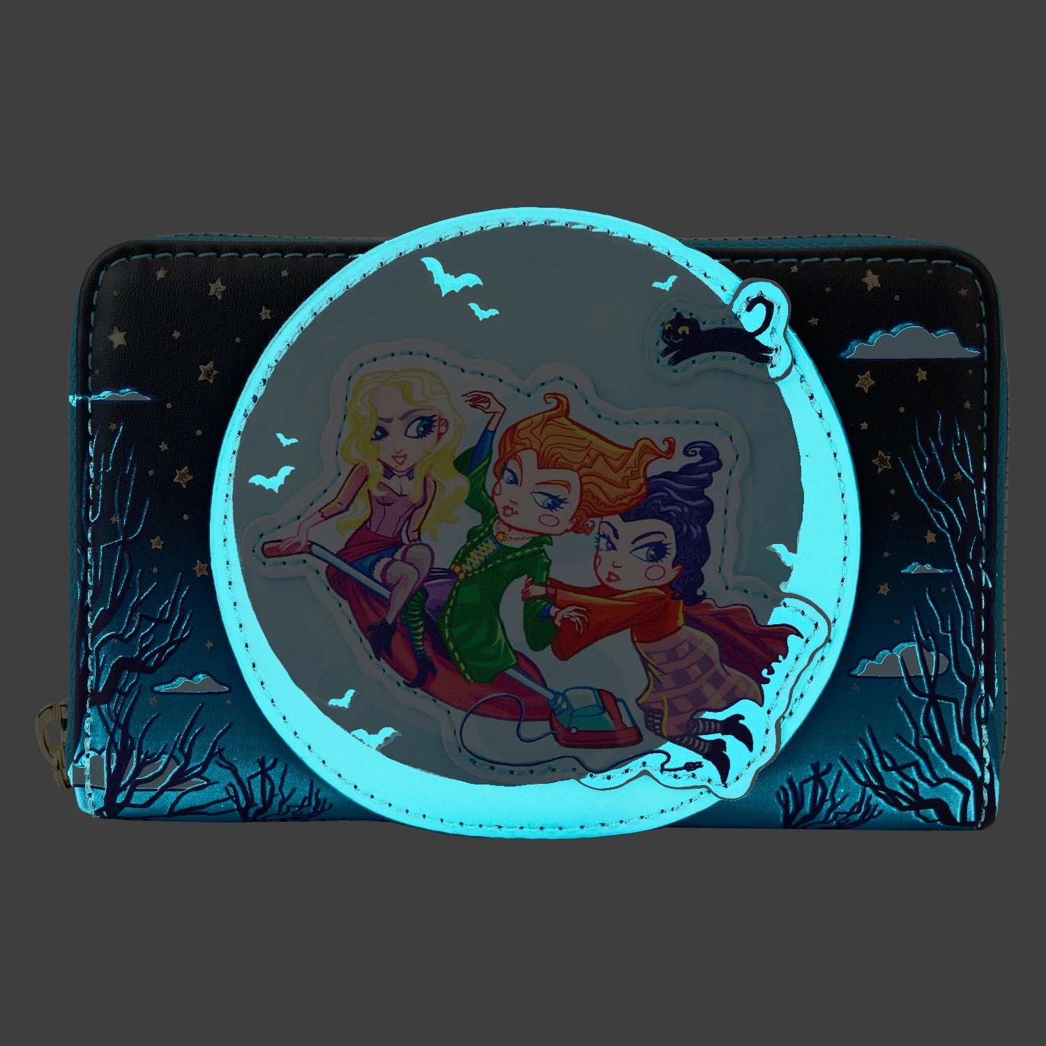 Sweep everyone off their feet with our bewitching Loungefly Disney Hocus Pocus Poster Zip-Around Wallet. The classic movie poster, from the original film, comes to life with unique, in-house drawn art. Atop a gold-foil star-studded sky, the Sanderson Sisters fly. Applique and debossed details reveal Winifred, Sarah, Mary—and a vacuum cleaner broom—soaring over the moon, which is a fully-figural die-cut applique. Binx also makes an appearance, flying over the Sanderson Sisters. Haunting details continue on the back, where Billy Butcherson, Max Dennison, Dani Dennison, and Allison gather at the gates of Old Burial Hill. In the dark, the edges of the moon on the front glow, along with the edges of the vacuum cleaner and outlines for the Sanderson Sisters. On the back, Billy Butcherson’s outline glows, as well as the outlines of the other characters with him and the gates to Old Burial Hill behind him. Inside, you’ll find 4 slots for holding cards and 1 clear slot for displaying your ID. Make a spellbinding entrance wherever you go with this frightfully fun accessory.