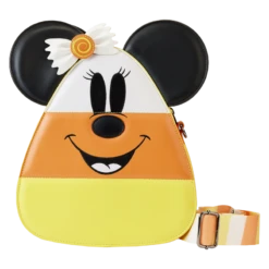 Looking sweet for trick or treat! Our Loungefly Disney Mickey Mouse and Minnie Mouse Candy Corn Crossbody Bag is double the fun. This reversible bag is shaped like a piece of candy corn, with classically colored stripes. In one view, Mickey Mouse’s adorable face appears with embroidered details that bring his smile to life. In another view, you’ll find Minnie Mouse, and her bow is a deliciously charming piece of candy placed in a glittery wrapper. The front and back panels for this bag are padded as well. Carry along your favorite treats for the day—or frequent all your favorite haunts in classic Disney style.