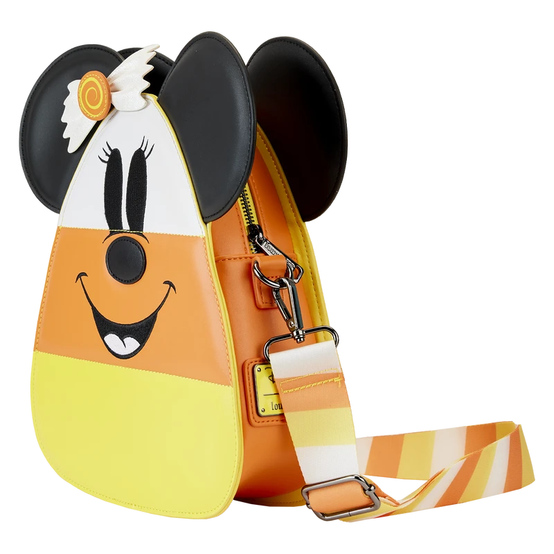 The Loungefly Disney Mickey Mouse and Minnie Mouse Candy Corn Crossbody Bag is made of vegan leather (polyurethane). Bag has adjustable straps and sturdy black-colored metal hardware. Additional features include applique, printed, embroidered, and glitter vegan leather details. Take note of the coordinating inside lining.
