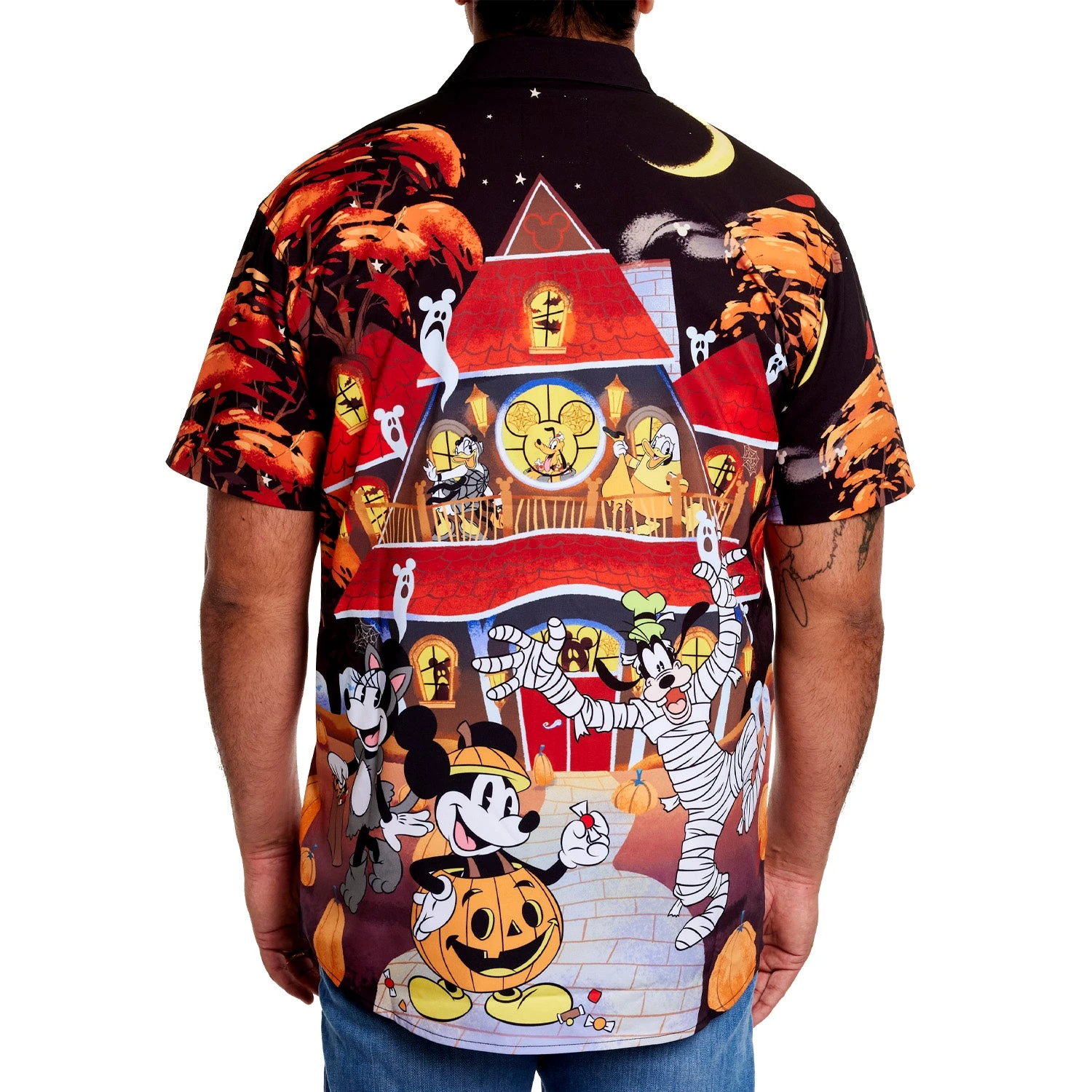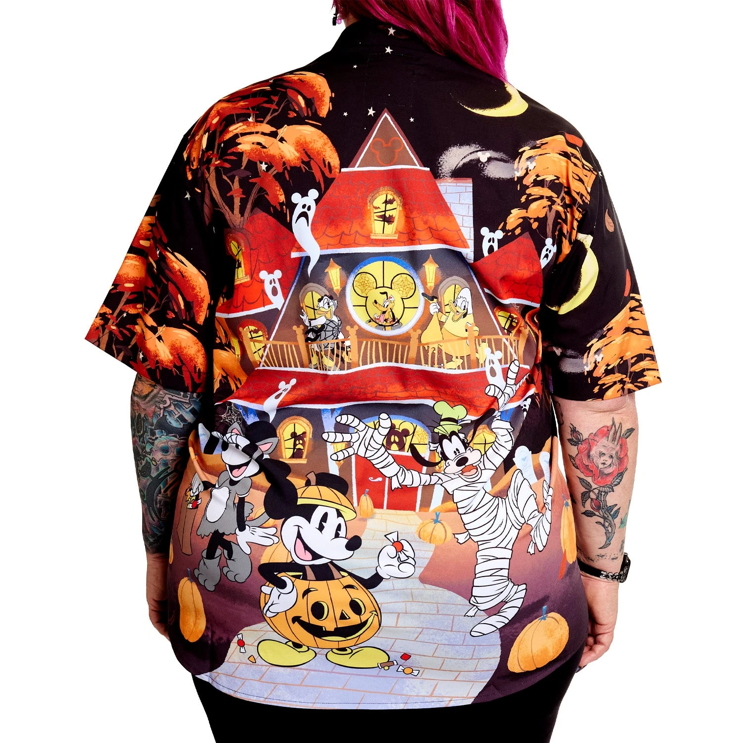 A monstrously fun house party is in full swing! Spirited adventures await when you wear our Loungefly Disney Mickey Mouse and Friends Haunted House Camp Shirt. This short-sleeved, button-down shirt features original, in-house, hand-drawn art of Mickey Mouse and his friends at a haunted house. In the foreground, Mickey Mouse, Minnie Mouse, and Goofy greet guests in Halloween costumes, their trick-or-treat bags filled to the brim with sweets. Behind them, ghosts rise from the graveyard, and all the windows of the house are lit. Donald Duck, Daisy Duck, and Pluto gather on the upstairs balcony. Orange-colored trees rise up against a dark background, and a crescent yellow moon hangs in the sky. Be the perfect ghost host for your own ghoulish get-togethers or simply make a delightfully haunting impression wherever you go.