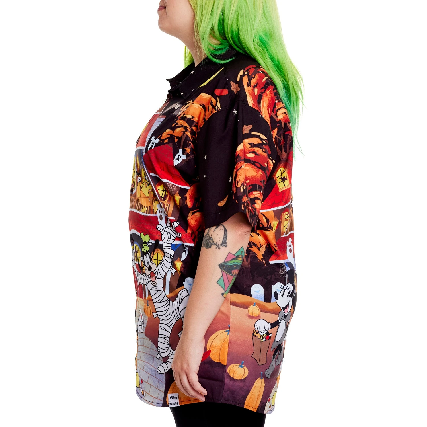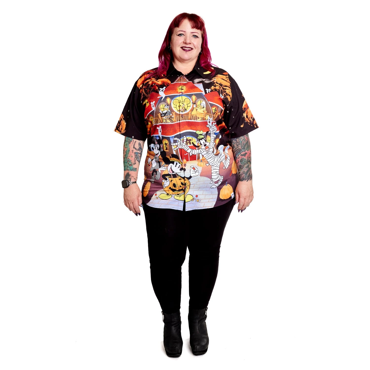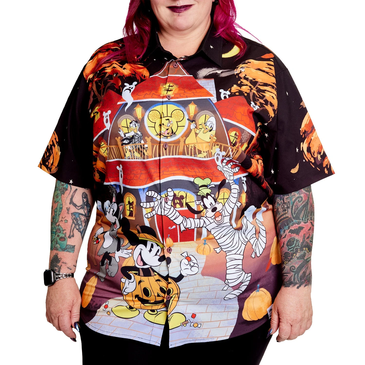 The Loungefly?Disney Mickey Mouse and Friends Haunted House Camp Shirt is 96% polyester and 4% elastane with a digitally printed design.