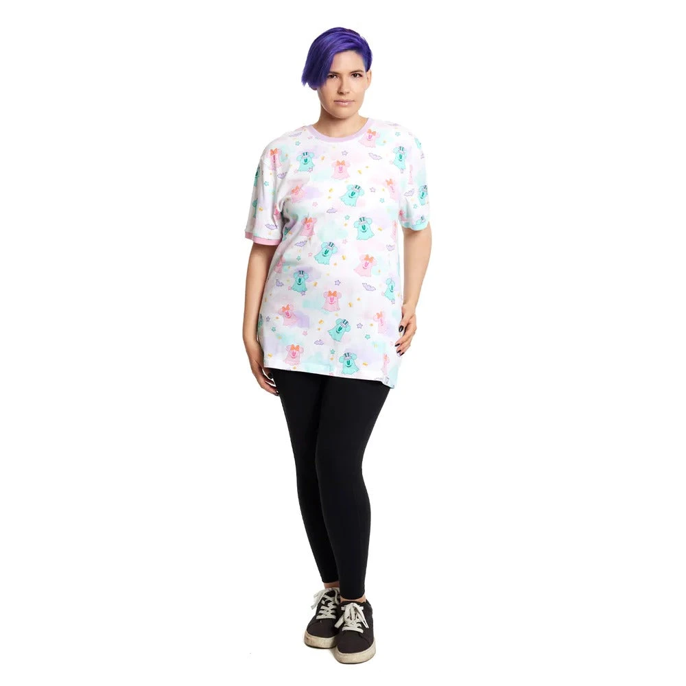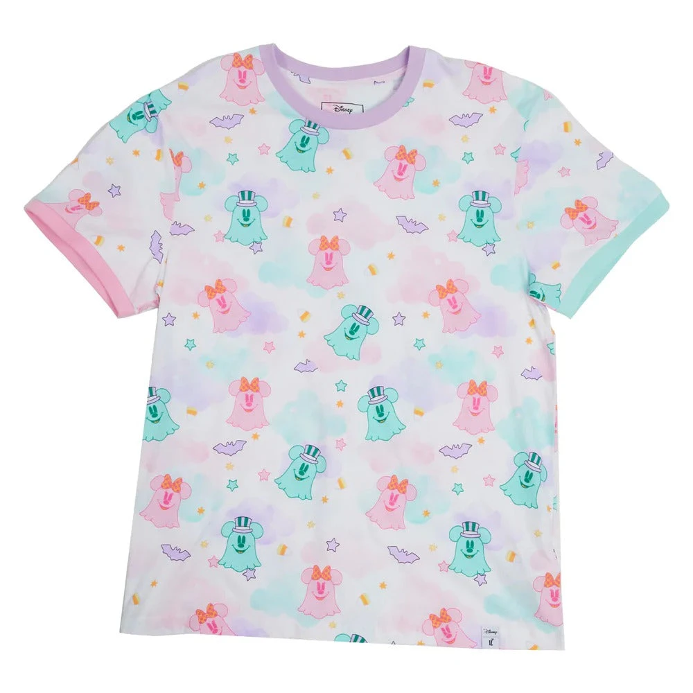 Slip into the spirit of the season with this boo-tiful Loungefly Disney Mickey and Minnie Mouse Pastel Ghost Unisex Tee. The all-over-print, in flowing pastels, features Mickey Mouse dressed as a ghost—and his ghoul-friend, Minnie Mouse. Together, they float in a motif of candy-corn pieces, clouds, and stars. Different colored rings, around the neck and sleeves, add pastel accents in purple, pink, and green. It’s the perfect tee-shirt for scaring up some fun—or for relaxing with a cup of hot apple cider after playing in the leaves.