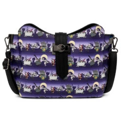 Halloween time is creeping up and now’s your chance to snag the Disney The Nightmare Before Christmas Halloween Line Crossbody Bag for your Loungefly collection. Among the ghostly scenery you’ll find Jack Skellington, Sally, Zero, the Mayor, Lock, Shock, Barrel, and the Harlequin Demon. This bag is great for a Halloween-themed outfit or for everyday use as you carry out your plans.