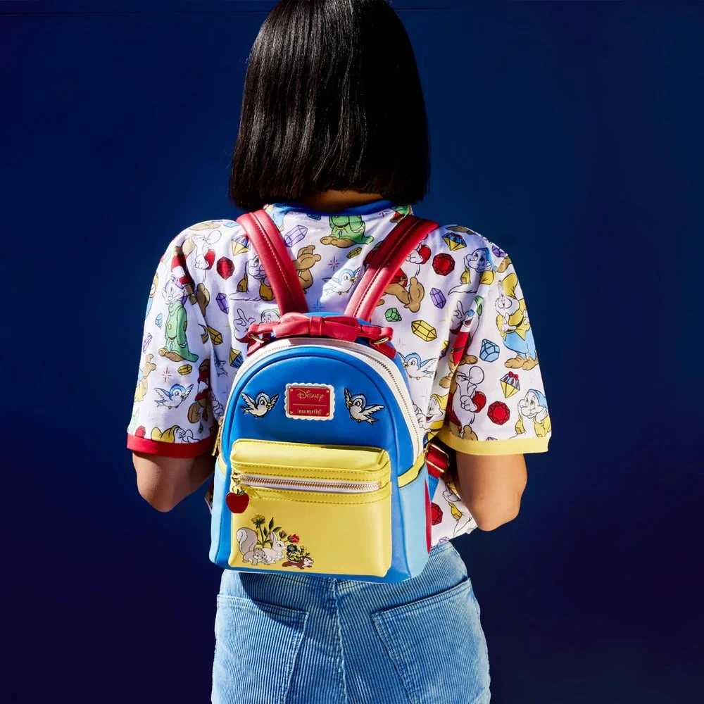 “With a smile and a song,” woodland creatures lend a hand to cheer Snow White. Their adorable presence is wrapped up with a bow on this 85th Anniversary Collection Loungefly Snow White 85th Anniversary Cosplay Mini Backpack.