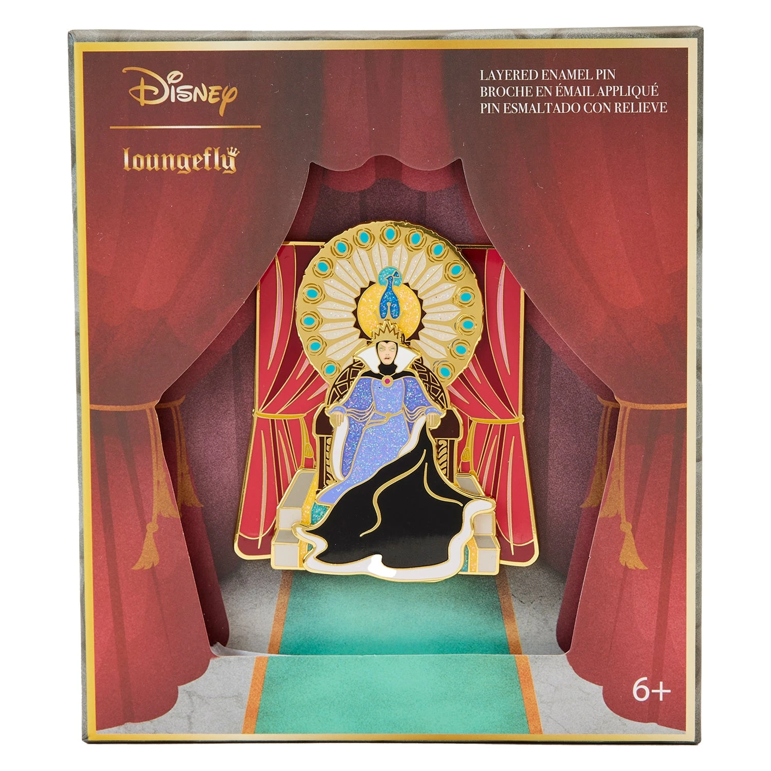 Elegantly evil and ready to rule! Bring on the reign with our Loungefly Disney Snow White Evil Queen Throne 3-Inch Collector Box Pin! The Evil Queen is looking particularly regal in the throne room. Layered elements bring all the details of this magnificent pin into view. Glitter sparkles on the Evil Queen’s dress. An elaborate circle of peacock plumes rises above her head, and red curtains billow in the background. It’s the perfect way to show off your fandom and add wickedly royal fun to your pin collection.