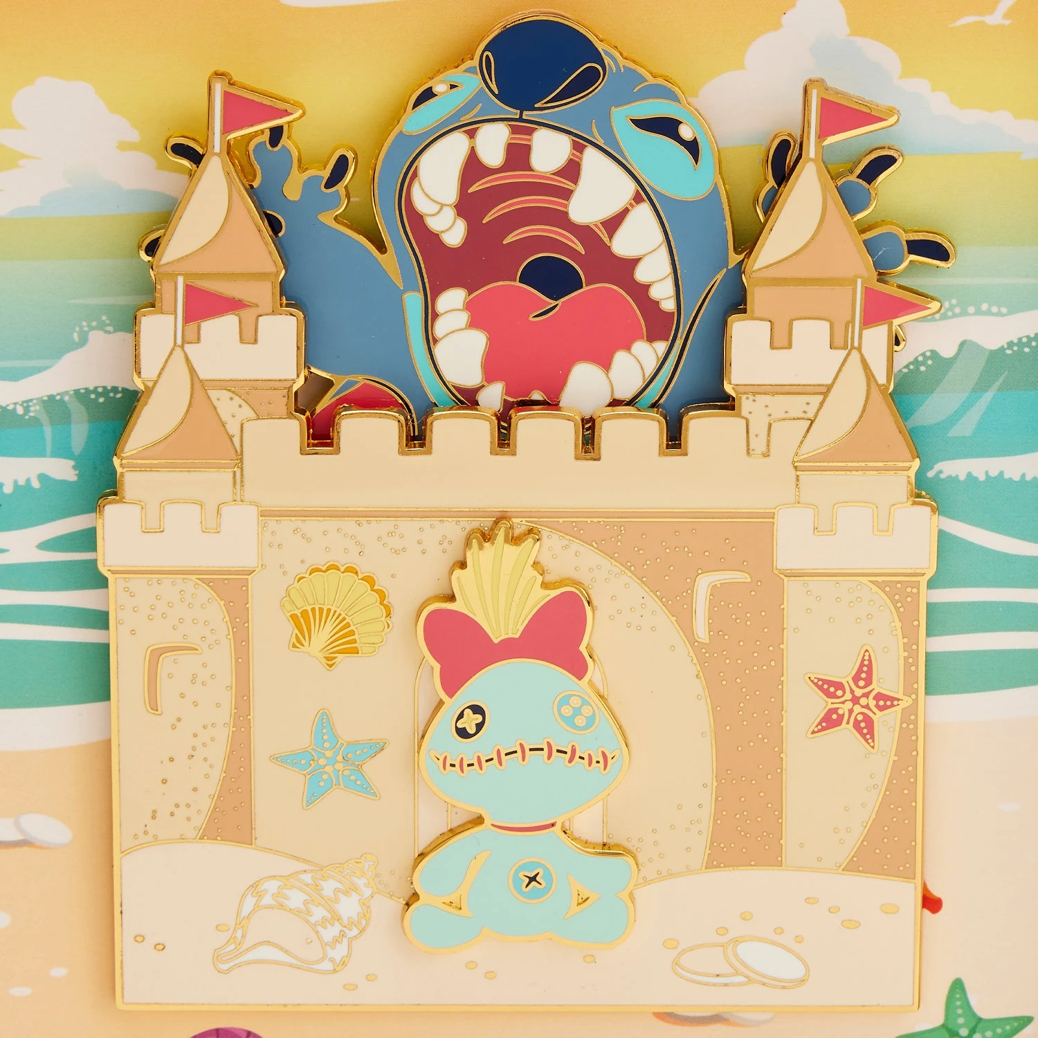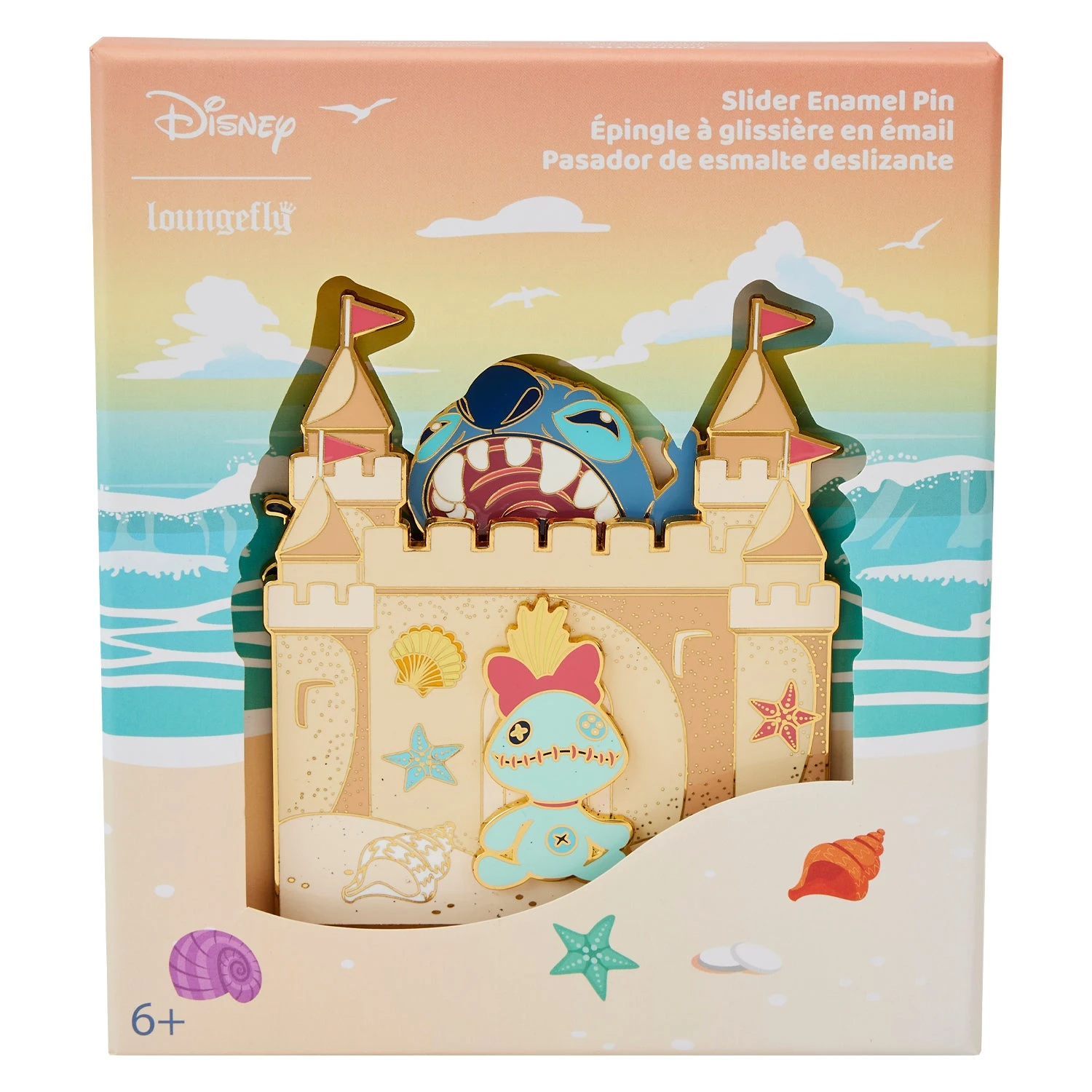 Out of this world and beachy keen! Escape for adventure with our Loungefly Disney Stitch Sandcastle Beach Surprise 3-Inch Collector Box Pin. Stitch looks ready to tear into a perfectly sculpted sandcastle, and he slides up and down on a movable mechanism on the back. Scrump appears outside the doorway of the castle, as well, amid decorative shells. It’s the perfect fun-in-the-sun addition to your Disney pin collection.