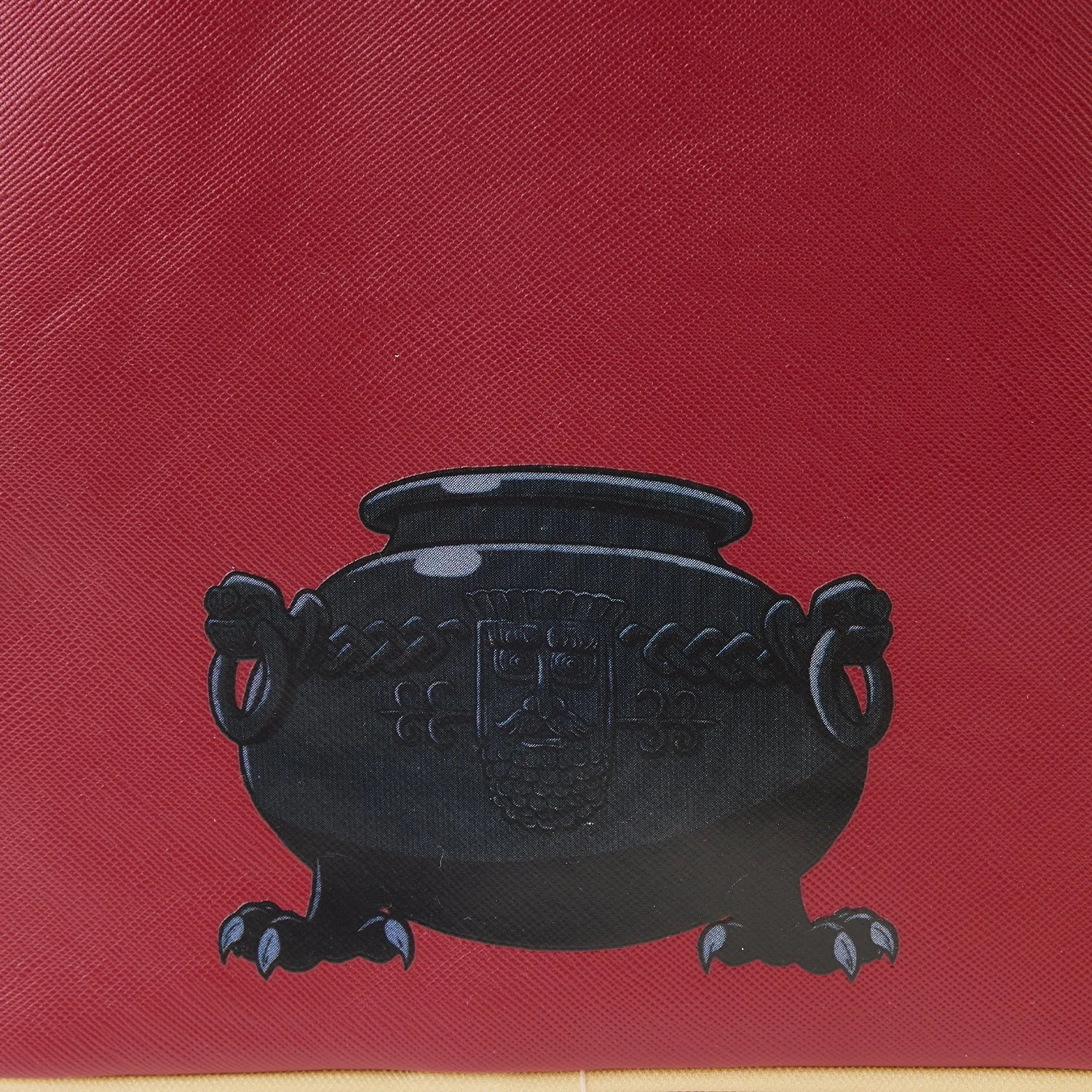 Stir the pot! Our Loungefly Disney The Black Cauldron Mini Backpack is brimming with details. On the front of this backpack, the Horned King wields his power over the cauldron, while an army of the “Cauldron-Born” rises up in eerie shadowed silhouettes behind him. On the front zipped pocket, Creeper confronts Taran, who brandishes his sword as he protects Hen Wen, Eilonwy, Gurgi, and Fflewddur Fflam. An enamel zipper charm of the sword finishes off the look in visionary style. On the back, the Black Cauldron makes an encore appearance. Make a frightfully fashionable entrance, wherever your travels may take you.