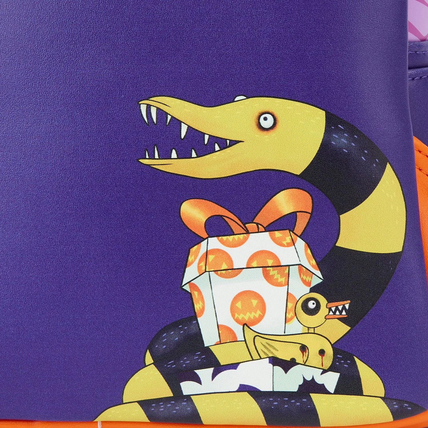 The Loungefly Nightmare Before Christmas Scary Teddy Present Mini Backpack is made of vegan leather (polyurethane). Bag has adjustable shoulder straps and gunmetal-colored hardware. Additional features include applique, embroidered, glow-in-the-dark, and printed details. Take note of the coordinating inside lining.