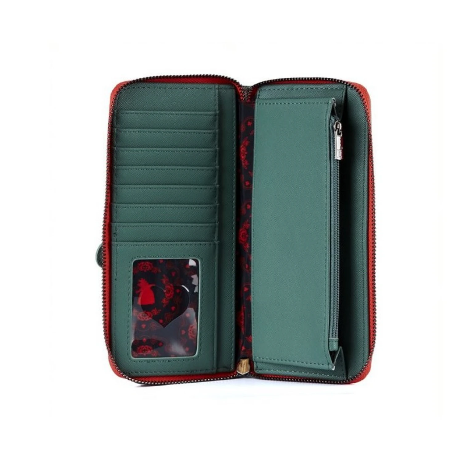 Remain in the Queen of Heart’s favor, and all is well in Wonderland. Fall out of favor, and heads will roll. Since 1951, the Queen of Hearts has reigned supreme in Disney’s Alice in Wonderland, and now she can watch over your valuables with this Loungefly Alice in Wonderland Queen of Hearts Villains Scene Zip Around Wallet.