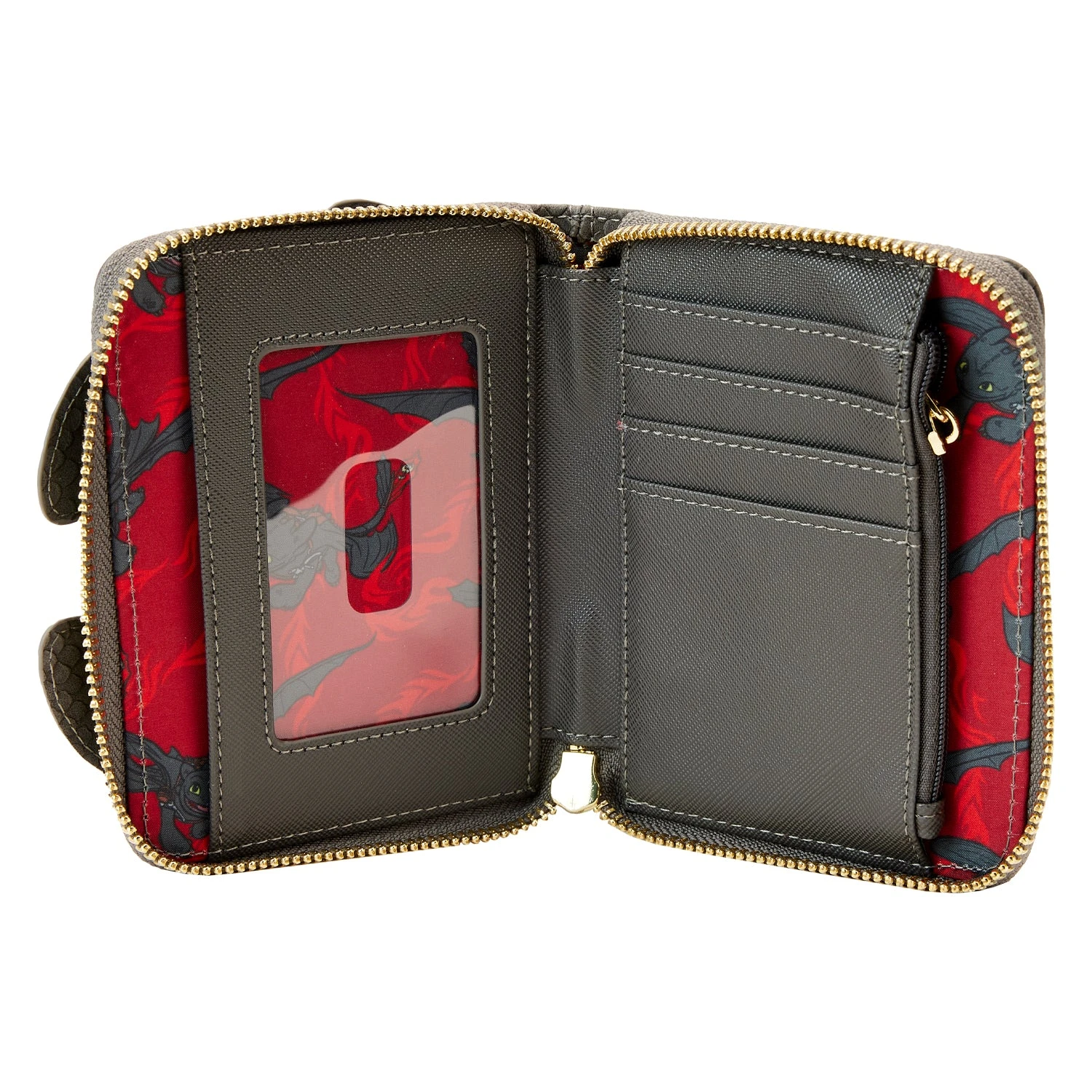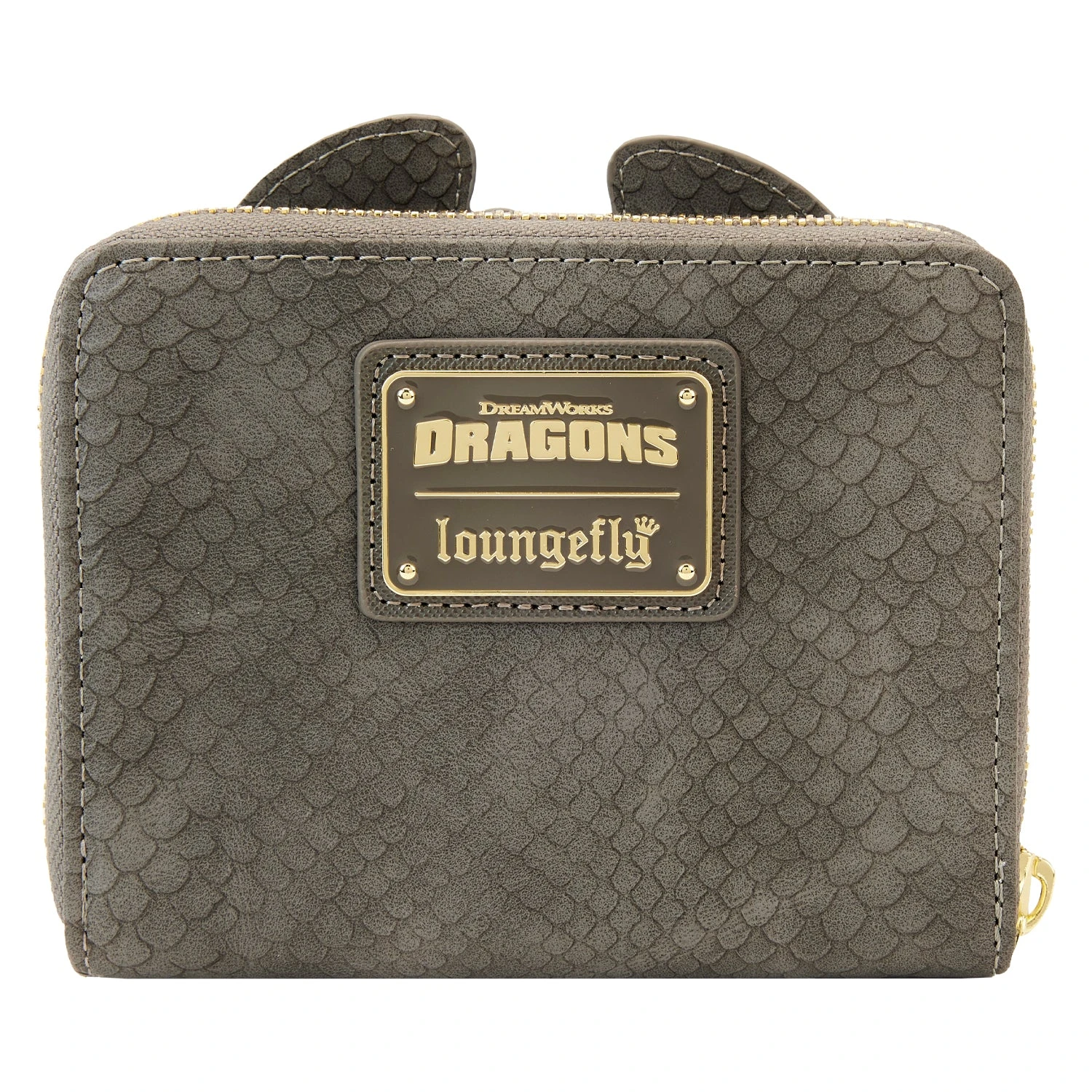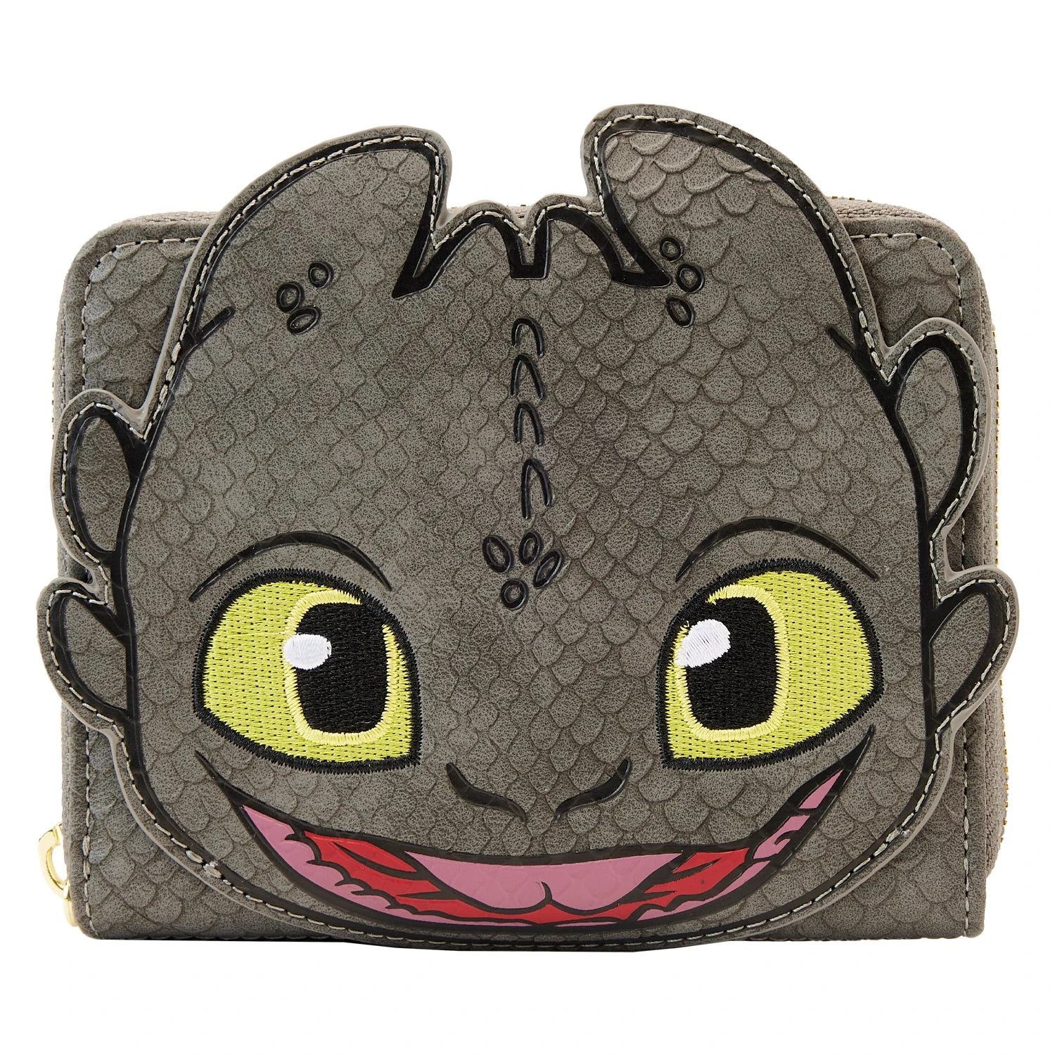 The Loungefly How to Train Your Dragon Toothless Cosplay Zip Around Wallet is made of vegan leather (polyurethane). Wallet zips closed with sturdy metal hardware. Additional features include applique, embossed, debossed, embroidered, and printed details. Take note of the coordinated inside lining.