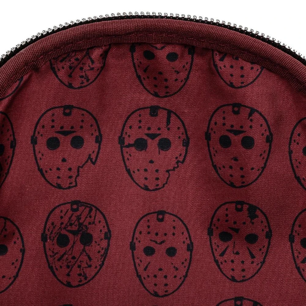 The Friday the 13th Jason Mask Mini Backpack is made of vegan leather (polyurethane). Bag has adjustable shoulder straps, sturdy metal hardware, and features: applique, embroidered, enamel zipper charm, and printed details. Take note of the coordinating pattern of the inside lining fabric.