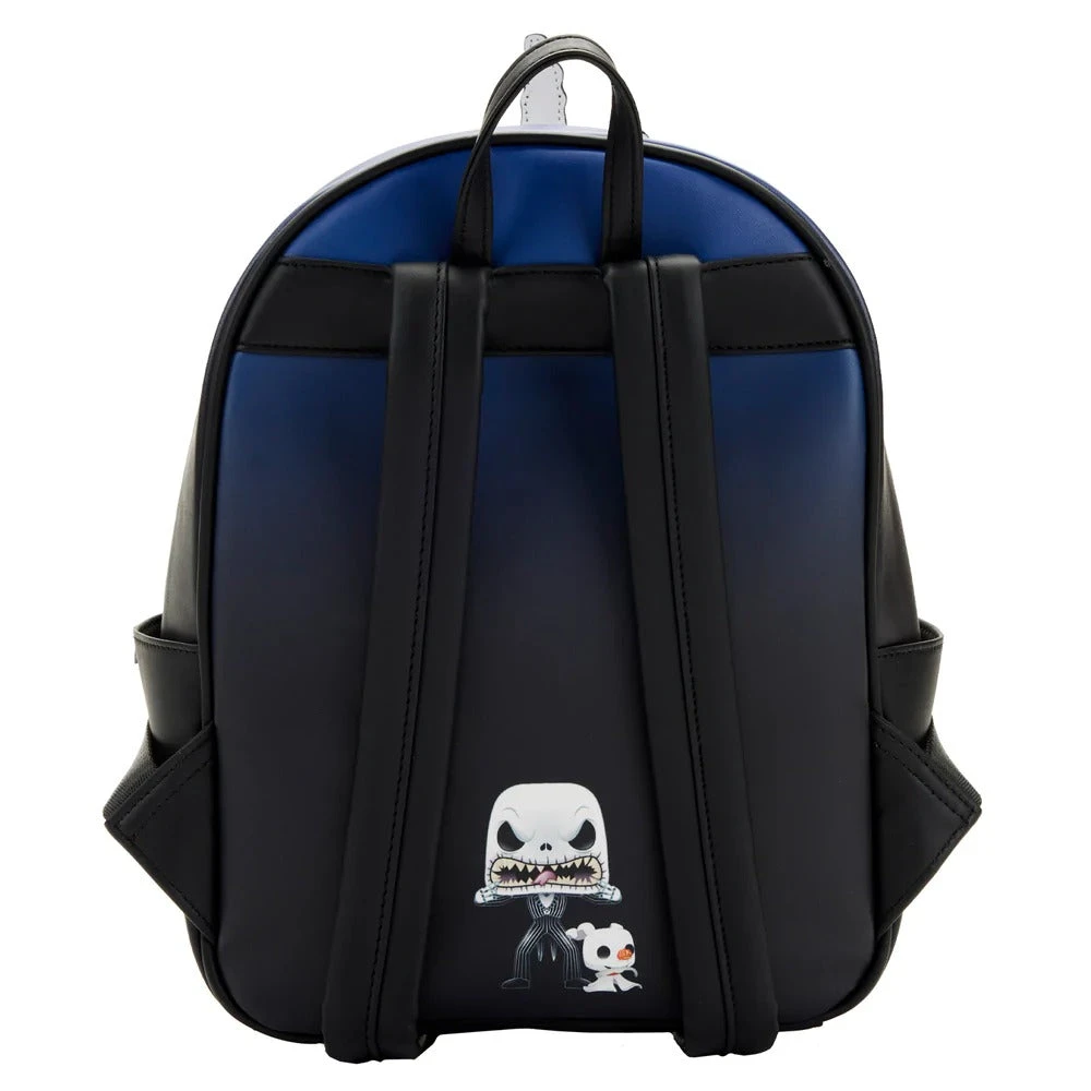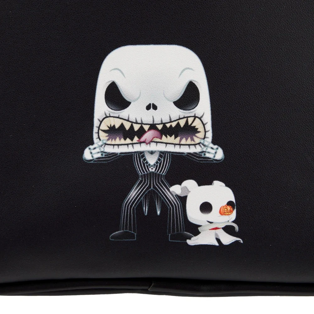 The Funko Pop! by Loungefly Jack Skellington Mini Backpack is made of vegan leather (polyurethane). Bag has adjustable shoulder straps and sturdy metal hardware. Additional features include applique, debossed, and printed details. Take note of the coordinating inside fabric lining.