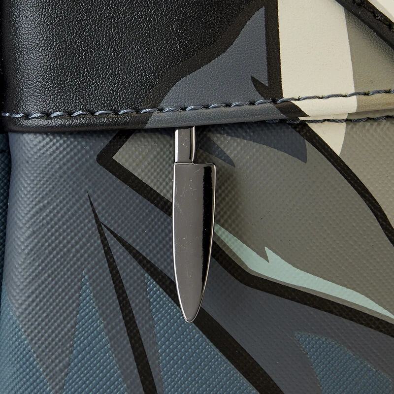Cue the haunting theme song and look sharp! Make an entrance with our Loungefly Michael Myers Halloween Cosplay Mini Backpack. Michael Myers’ eerie, masked face comes to life in applique detail, rising up over the top edge of the backpack. In the dark, the entire face glows! The front zipped pocket features applique shirt pockets and a collar. A metal zipper charm, in the shape of a knife, is a pointed nod to the legacy of this slasher film. On the back, you’ll find the famous house setting for this classic Halloween movie, along with the words, “The Night He Came Home”—and they glow in the dark! Pack just what you need to enjoy a night of fun watching scary movies at friends’ houses—or simply visit your favorite haunts in style.