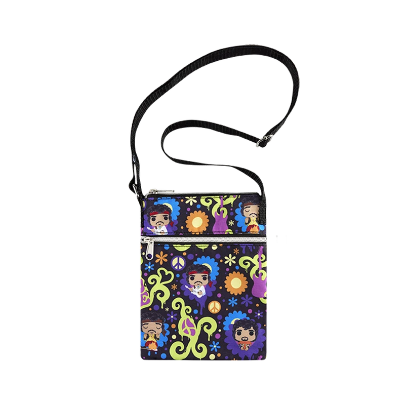 The Loungefly Funko Pop! Jimi Hendrix Love & Flowers Passport Bag is made of canvas material. Bag has adjustable shoulder strap, shiny gold hardware, and features printed details.