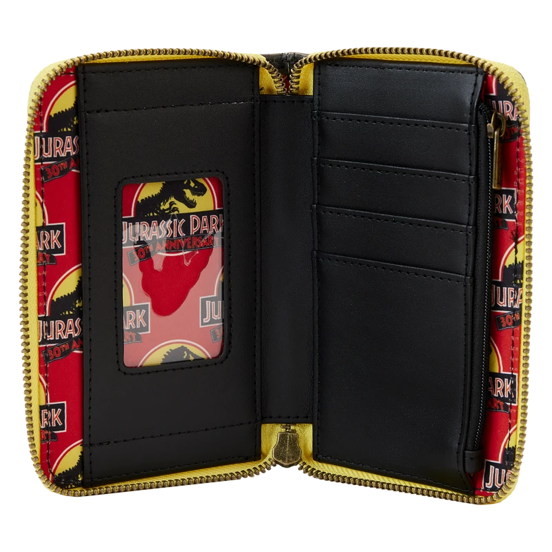 The Loungefly Jurassic Park 30th Anniversary Dino Moon Glow Zip Around Wallet is made of vegan leather (polyurethane). Wallet zips closed with sturdy metal hardware and features five card slots with a clear slot for holding ID. Additional features include embossed and printed details. Take note of the coordinating inside lining.