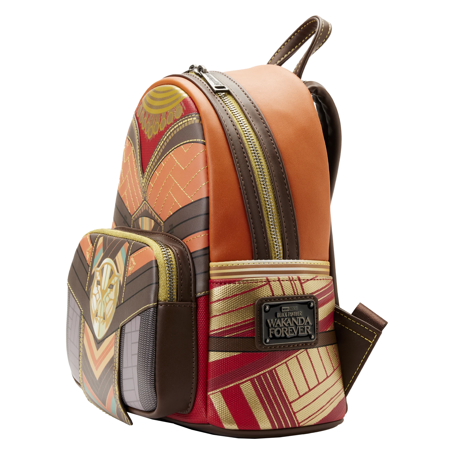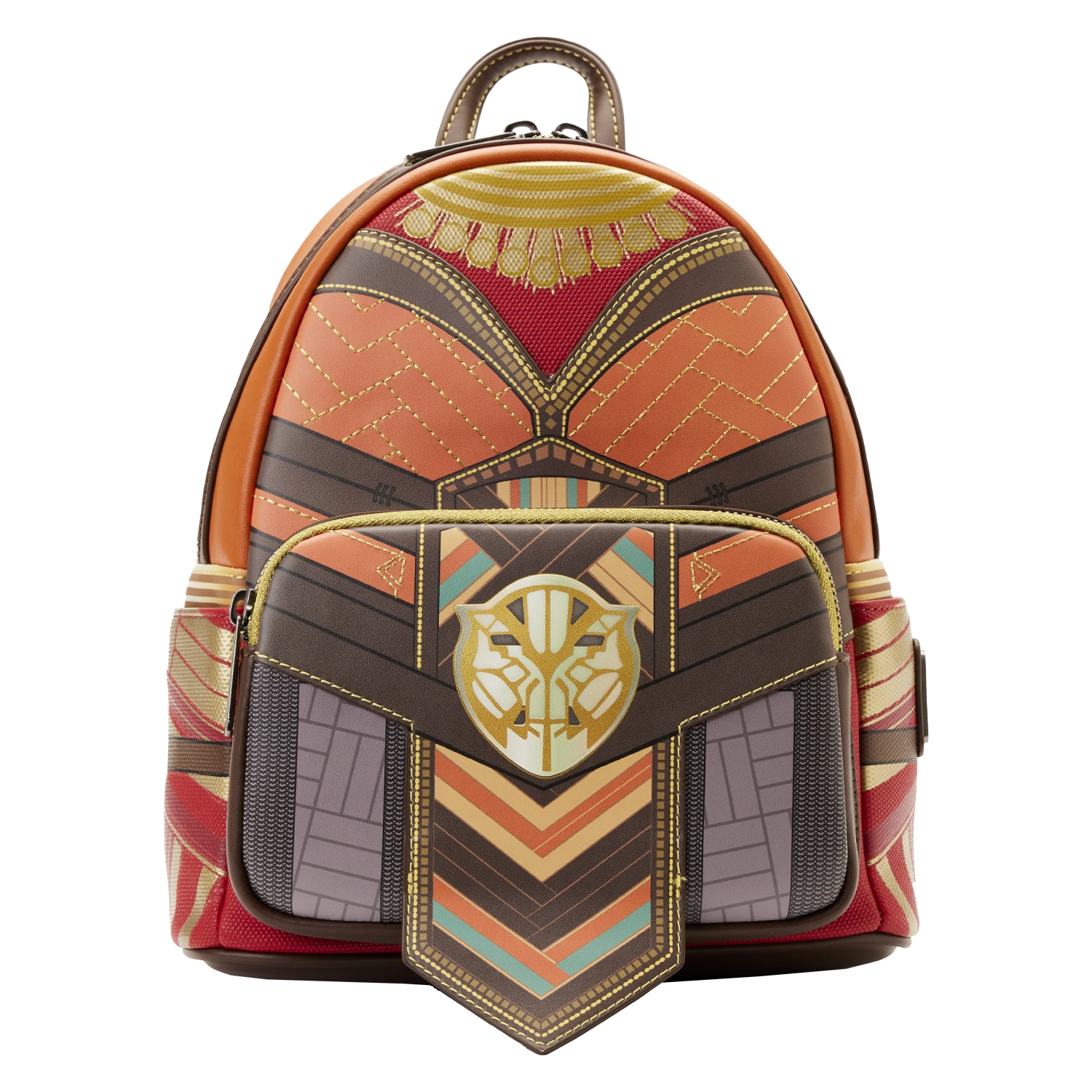 Rise and embrace the legacy of Wakanda. The Loungefly Black Panther Okoye Cosplay Mini Backpack takes the form of one of Wakanda’s fiercest warriors. On the front, Okoye’s traditional necklace and belt accompany the designs of her battle outfit. Turn the bag around to find the logo of Marvel Studios’ Black Panther: Wakanda Forever. This inspiring accessory makes a heroic addition to any outfit and will keep your belongings safe on every mission.