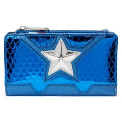 The Loungefly Marvel Metallic Captain America Cosplay Flap Wallet is made of vegan leather (polyurethane). This bifold wallet has sturdy silver-colored metal snaps and zippers to keep everything in place. Additional features include debossed, applique, glitter, metallic, iridescent, and printed details. Take note of the coordinating inside lining.