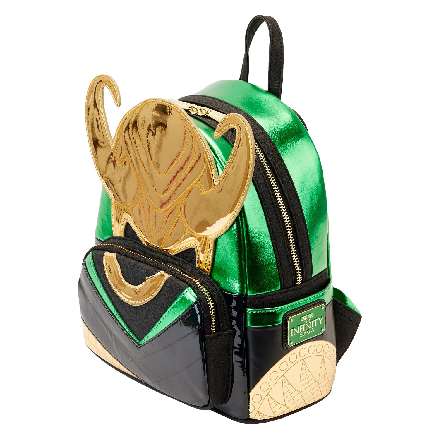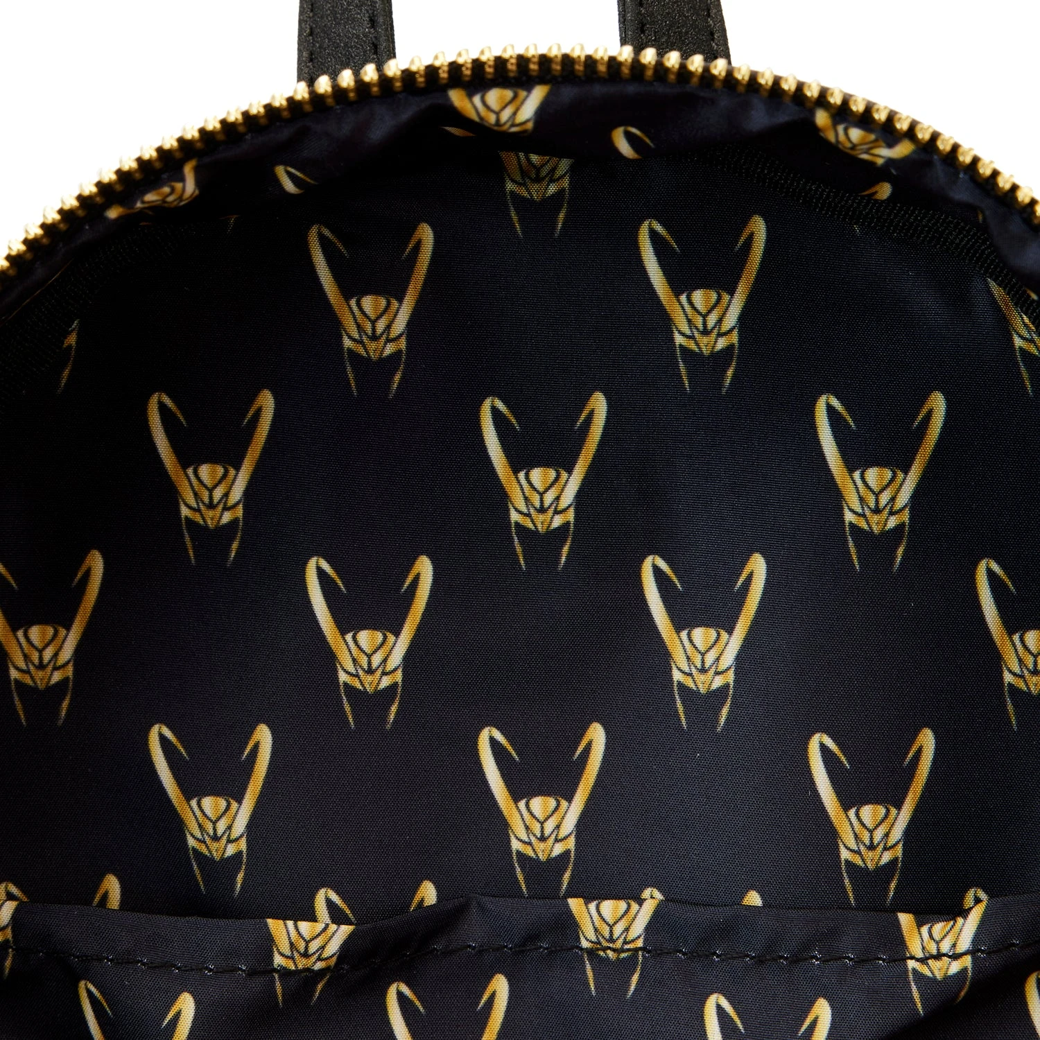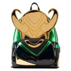The Loungefly Marvel Metallic Loki Mini Backpack is made of vegan leather (polyurethane). Bag has adjustable shoulder straps and shiny gold hardware. Additional features include applique, debossed, glitter, metallic, and printed details. Take note of the coordinating inside lining.