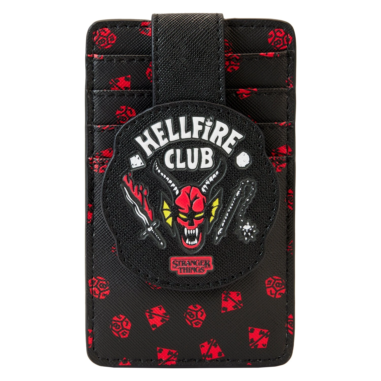 The Loungefly Netflix Stranger Things Hellfire Club Card Holder is made of vegan leather (polyurethane). Additional features include applique and printed details. This card holder is an officially licensed Netflix product. Card holder dimensions: 3”W x 5”H