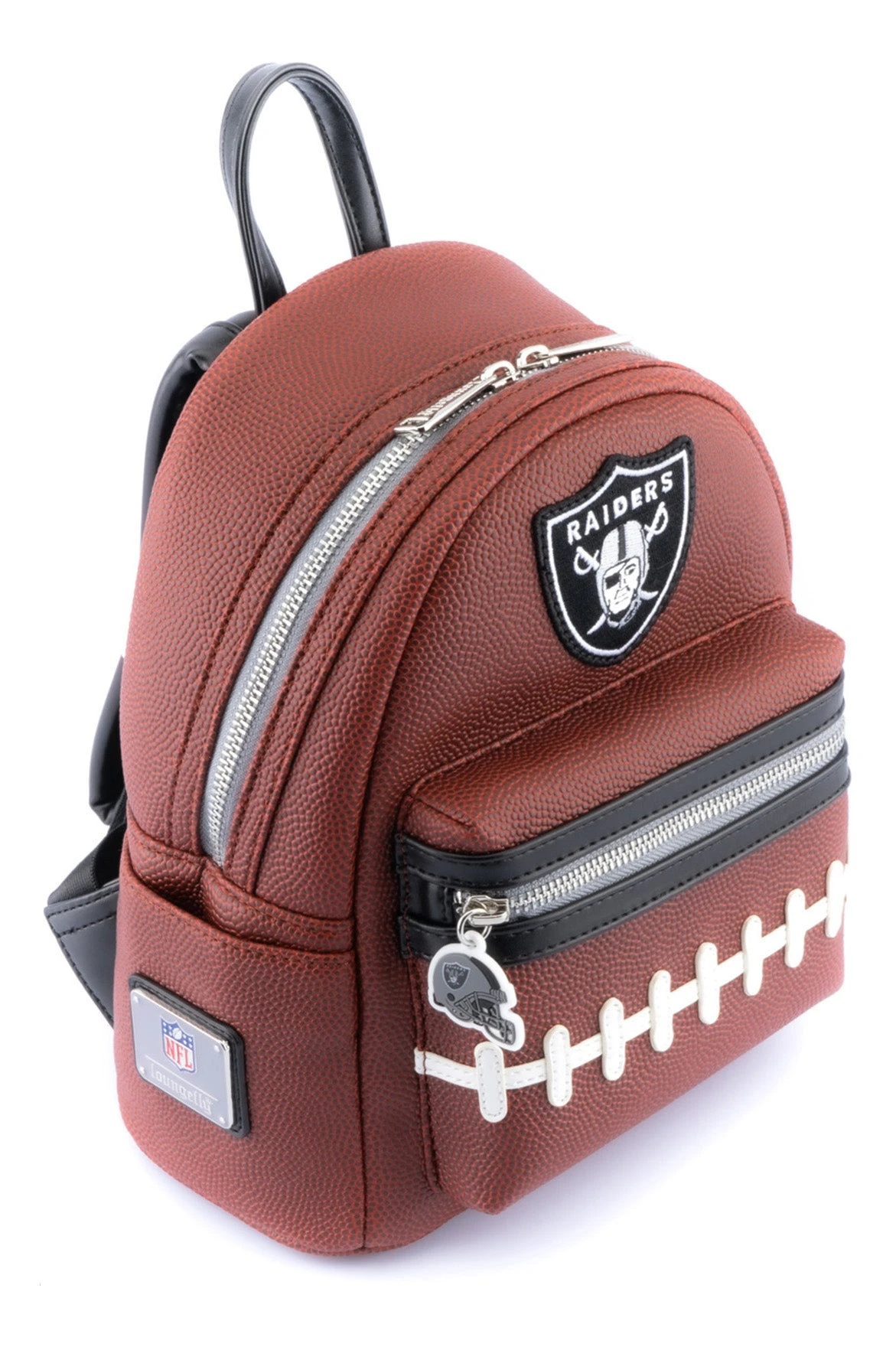 Represent your favorite team whether you’re on your way to practice, a game, or just out running errands with the National Football League Loungefly accessories! This NFL Las Vegas Raiders Pigskin Logo Mini Backpack is a touchdown for any Raiders fan. The backpack is textured to mimic a football and features an embroidered patch of the team name on the front. It’s perfect for carrying everything you need to and from games.