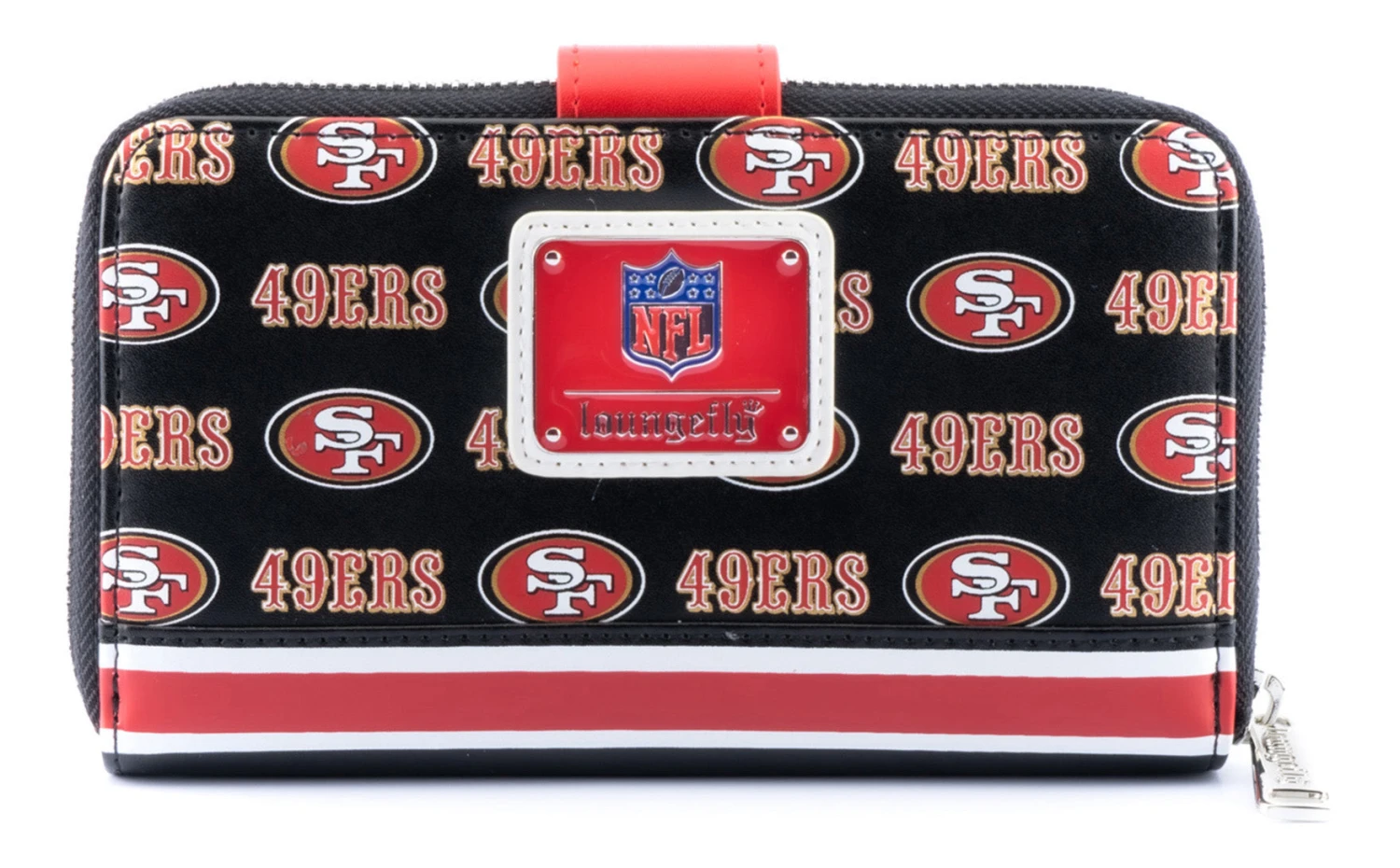 Represent your favorite team whether you’re on your way to practice, a game, or just out running errands with the National Football League Loungefly accessories! This NFL San Francisco 49ers Logo Zip Around Wallet is a touchdown for any 49ers fan. This black wallet is covered in the team’s logo and features a molded metal rivet of the team logo on the snap closure. It’s perfect for carrying everything you need to and from games.