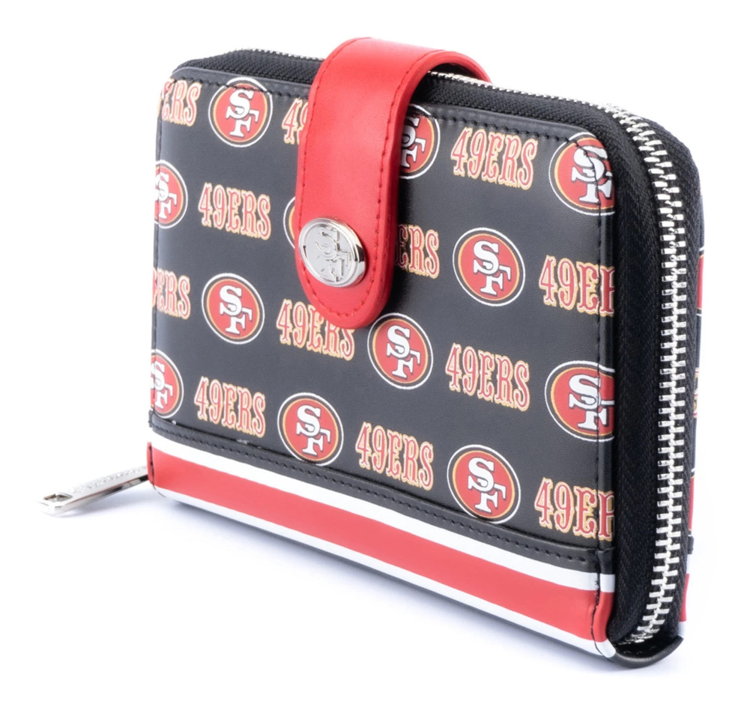 The NFL San Francisco 49ers Logo Zip Around Wallet is made of vegan leather (polyurethane). Wallet snaps and zips closed, has sturdy metal hardware, and features: metal rivet, and printed details. Take note of the coordinating pattern of the inside lining fabric.