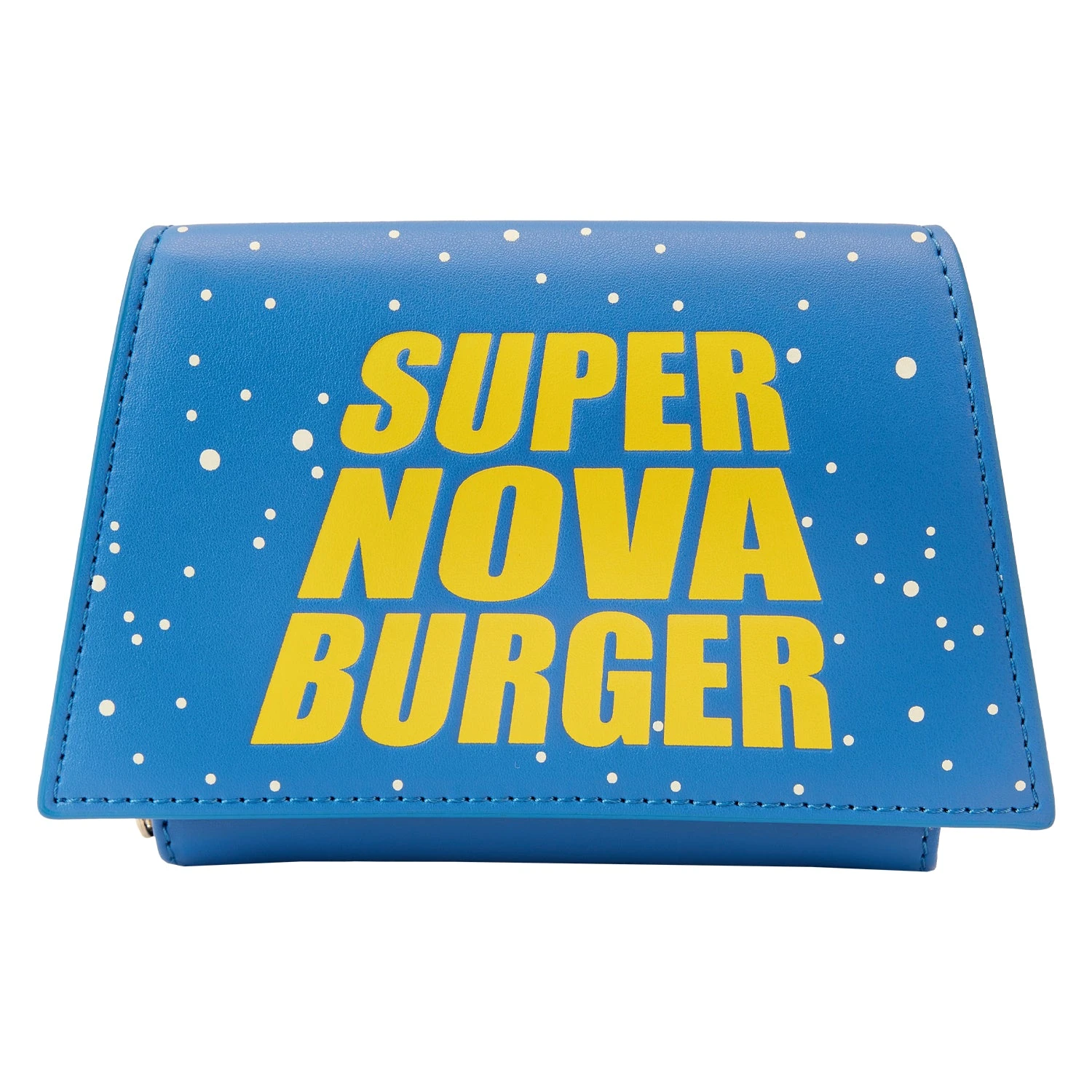 Order up! The Loungefly Toy Story Pizza Planet Super Nova Burger Wallet is the perfect disguise for your next mission. Taking the shape of a fast-food container, the front of this accessory displays the Super Nova Burger logo against a starry glow-in-the-dark background. On the back, the Pizza Planet logo appears on a zippered coin pouch. Open the wallet’s front flap to reveal Buzz Lightyear as he goes undercover! With three slots for holding cards and a clear slot for ID, this accessory will keep your belongings safe as you sneak toward your next destination.