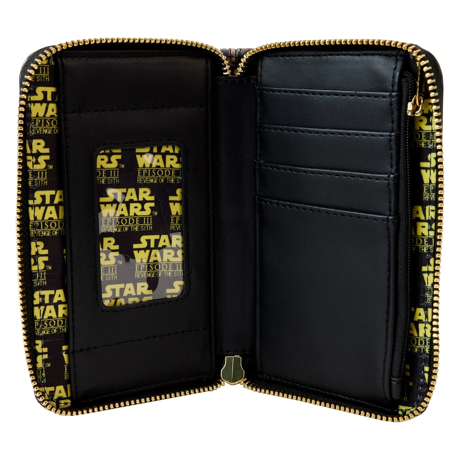 The Loungefly Star Wars: Episode III – Revenge of the Sith Scene Zip Around Wallet is made of vegan leather (polyurethane). Wallet zips closed with sturdy metal hardware and features printed details. Take note of the coordinating inside lining.