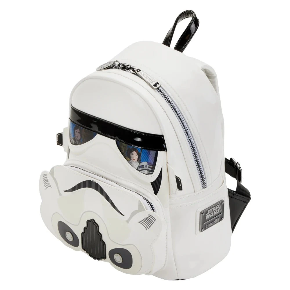 Blast through your day with the help of a Star Wars Stormtrooper with this Stormtrooper Lenticular Cosplay Mini Backpack. The backpack, which includes a zipped front pocket, takes the shape of a Stormtrooper’s white helmet and face. A lenticular screen placed in the eyewear reveals, in an alternate view, Hans Solo, Chewbacca, and Princess Leia. An embroidered Stormtrooper symbol appears on the back.