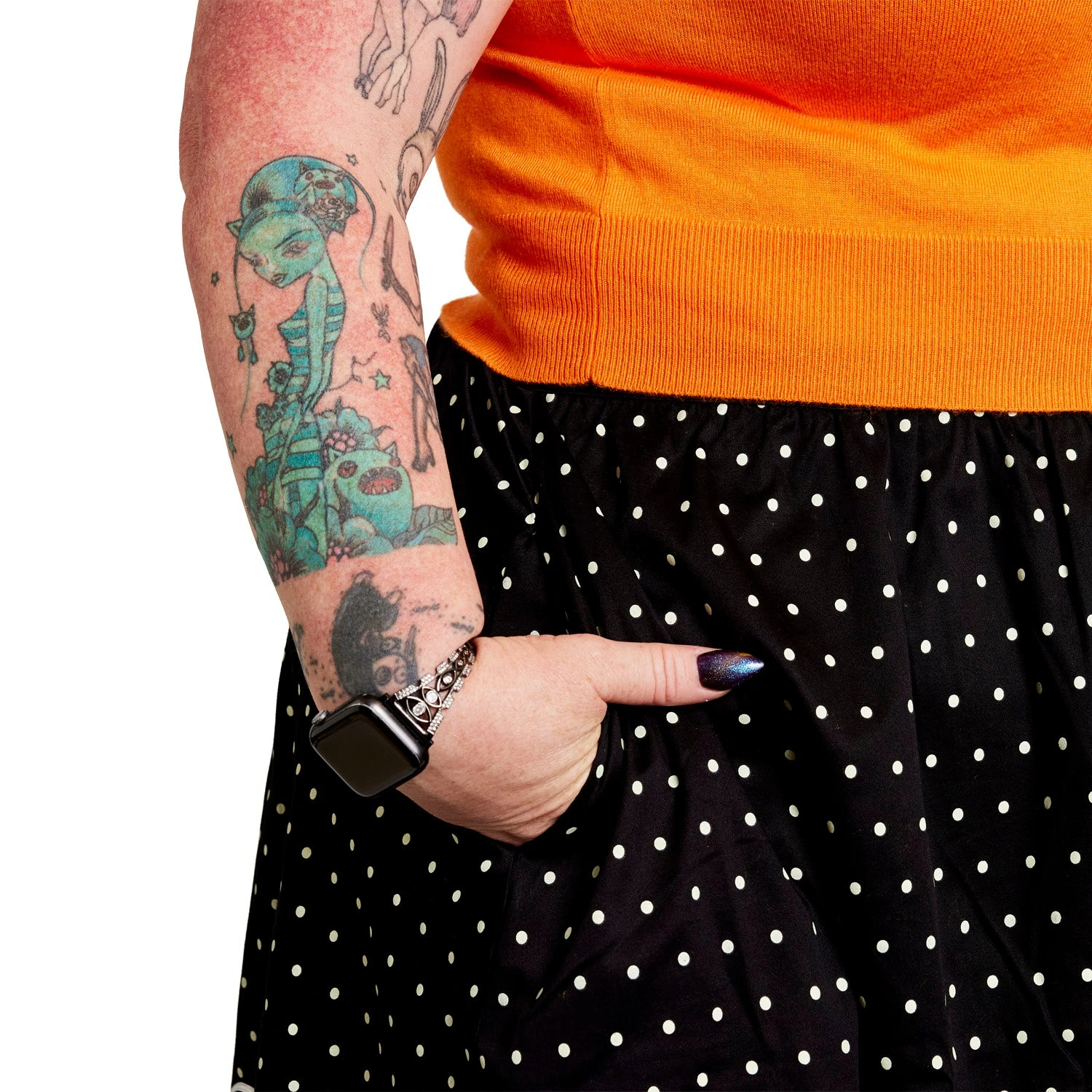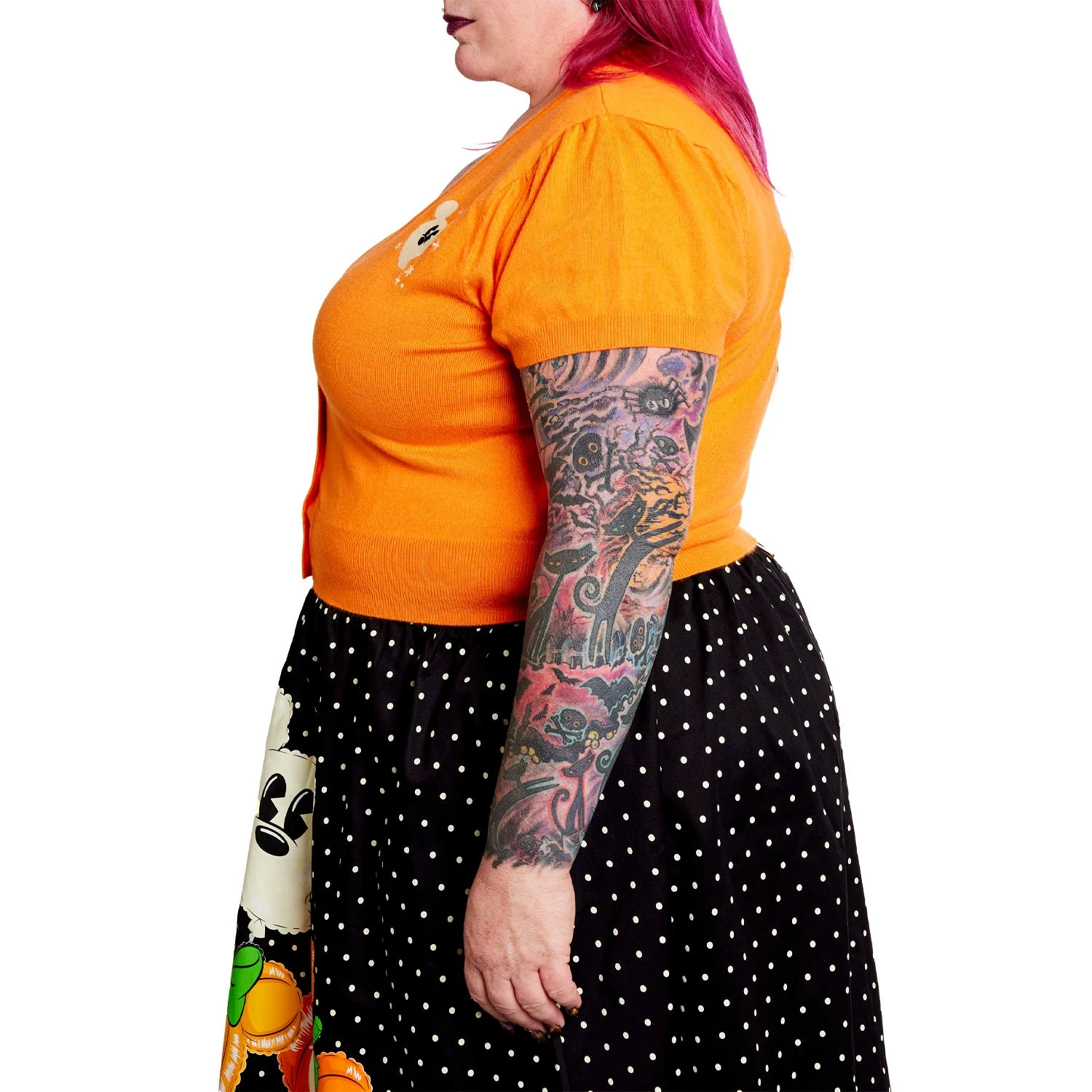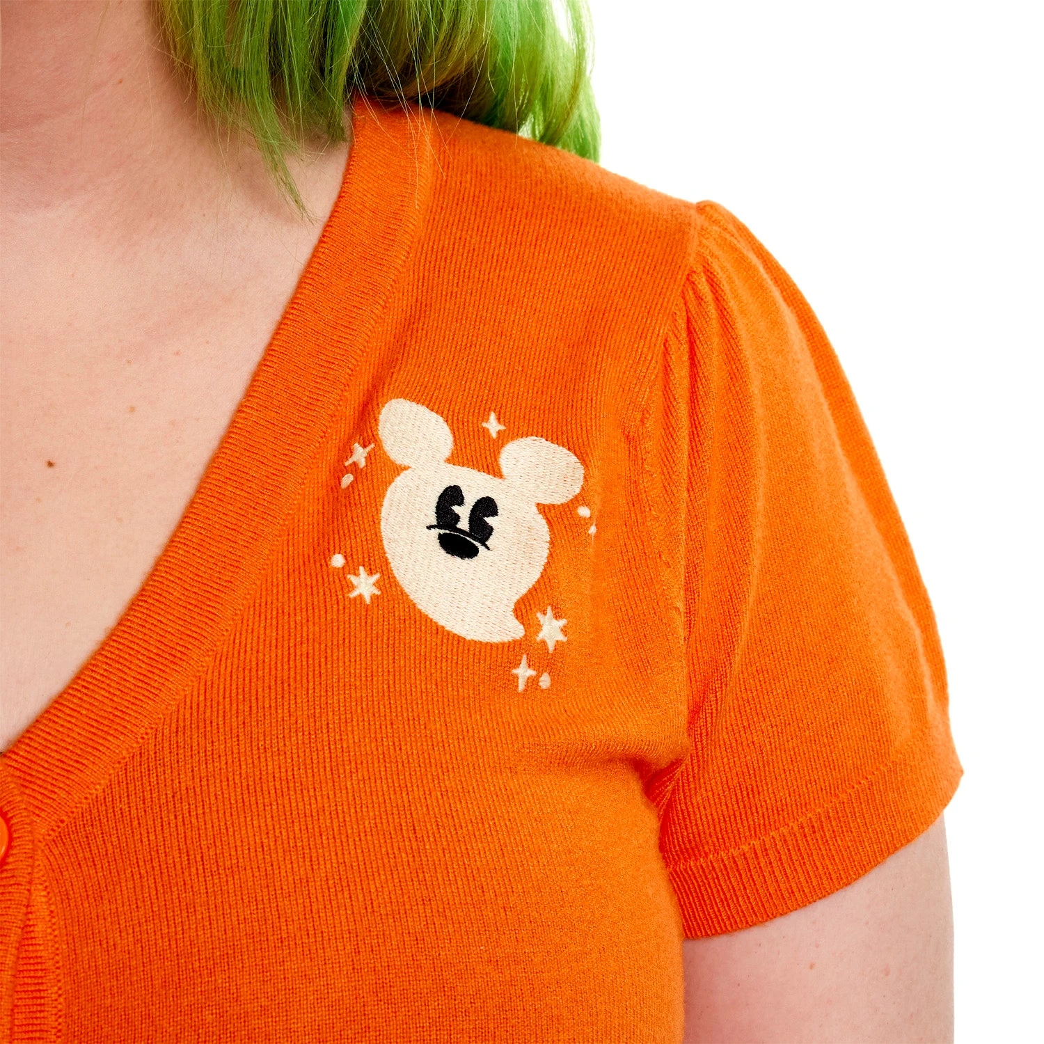 As pumpkin balloons line Main Street, U.S.A., don’t miss a beat. Float through the boutiques in festive style with our Stitch Shoppe Disney Minnie Mouse Spooky Balloon “Domonique” Puff Cardigan. We’ve elevated our fitted, crop top, button-down, V-necked cardigan with puffy sleeves and glow-in-the-dark details. On the front top corner of this pumpkin-colored cardigan, a small embroidered Mickey Mouse balloon appears, and it glows in the dark! On the back, the Minnie Mouse “mylar foil” pumpkin balloon is a fully embroidered applique patch. The string at the bottom spells out “Boo,” and at the end, you’ll find an orange and white-striped wrapped treat. Enjoy a boo-tiful day in the parks, or simply have a wickedly wonderful time at all your favorite haunts.