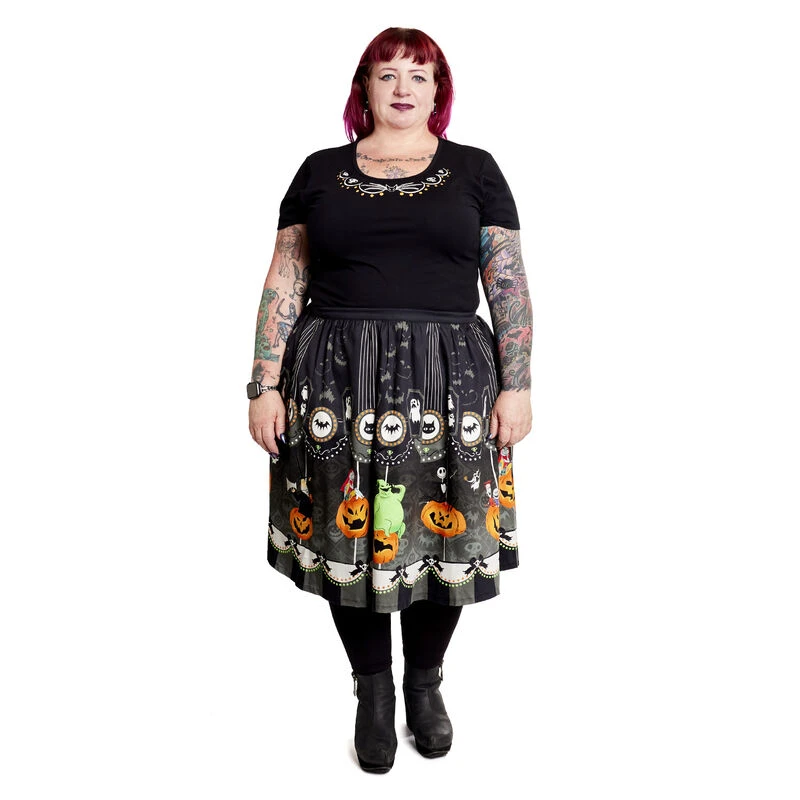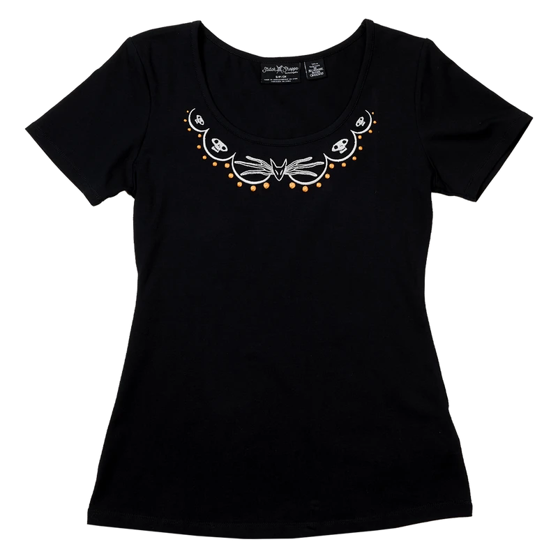 In our town of Halloween, haunt couture is always top of mind. Dress for the occasion with the Stitch Shoppe by Loungefly Nightmare Before Christmas “Kelly” Top. On the front, Jack Skellington’s bowtie accompanies a skull motif embroidered along the neckline. As daylight fades, you’ll see the stitched details glow in the dark. This versatile shirt is a trendy option for any time of day and can be paired with various skirts or pants to create the perfect Disney-themed outfit.