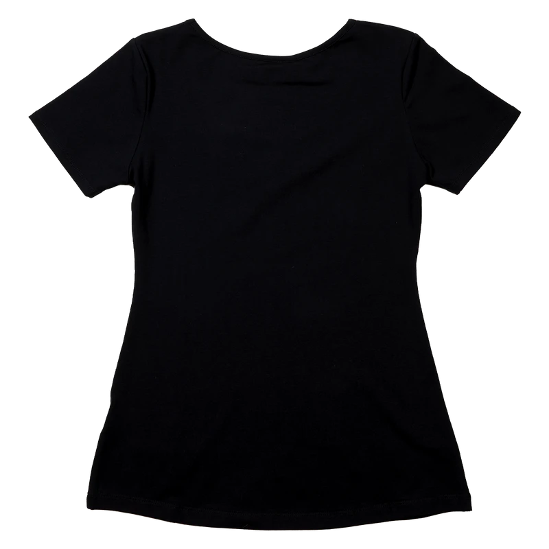 This Kelly-style top is made of 97% cotton and 3% Spandex. This scoop tee is super soft and stretchy and features embroidered glow-in-the-dark details on the front. This quarter-length shirt covers the shoulders and can be easily layered with cute sweaters and coats during cooler temperatures.