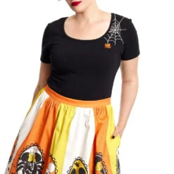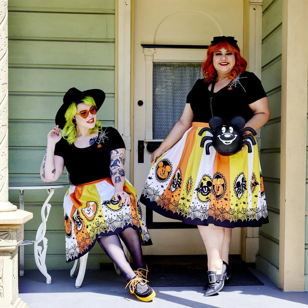 Be scary fashionable this Halloween with the Stitch Shoppe Mickey Mouse Spider Web Kelly Fashion Top. The top features embroidered white spider webbing, accompanied by a little orange Mickey Mouse spider. The lanterns are lit to reveal this hauntingly cute Disney design.