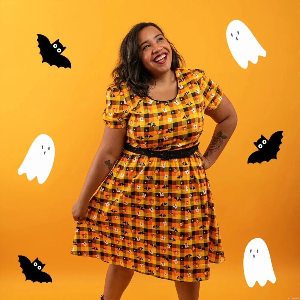 Bring a touch of not so scary Halloween cuteness into your wardrobe by wearing the Disney Stitch Shoppe Spooky Mickey and Minnie Mouse “Laci” Dress. Across this orange, yellow, and black gingham pattern are Mickey Mouse and Minnie Mouse as ghosts, jack-o-lanterns, and jack-o-lantern bats. The neckline has black piping trim and the dress comes with a black belt.