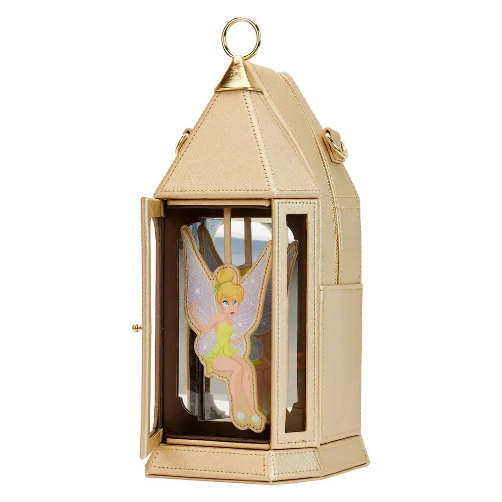 “Light the way! This feisty fairy has fallen for one of Captain Hook’s schemes on the exclusive Loungefly Stitch Shoppe Tinker Bell Figural Lantern Crossbody Bag. Shining in the light, this metallic bag brings a beloved scene from the animated classic to life as it takes the shape of a vintage lantern. Looking for escape, Tinker Bell flutters inside the lantern’s see-through door. Turn the bag around to see Tink make an encore appearance along with the phrase “do you believe in fairies?” This illuminating accessory is the perfect piece for any Disney-themed outfit as you explore Never Land and beyond.