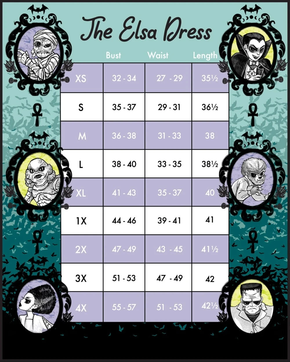 Why pick one when you can have all of your favorite Universal Monsters cameo in your Halloween wardrobe? Revive your wardrobe this Halloween season with the Universal Monsters Stitch Shoppe “Elsa” Dress. Framed with distressed flocking details along the bottom of the skirt are the Bride of Frankenstein, Frankenstein, Dracula, Creature from the Black Lagoon, Wolf Man, and the Mummy. The spectacularly spooky dress features velvet piping and comes with a black belt.