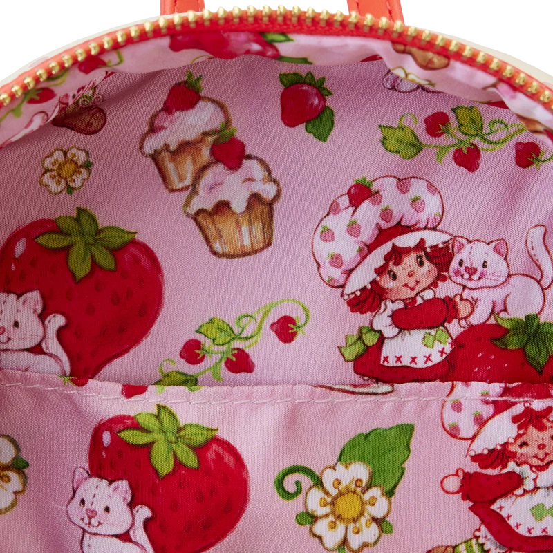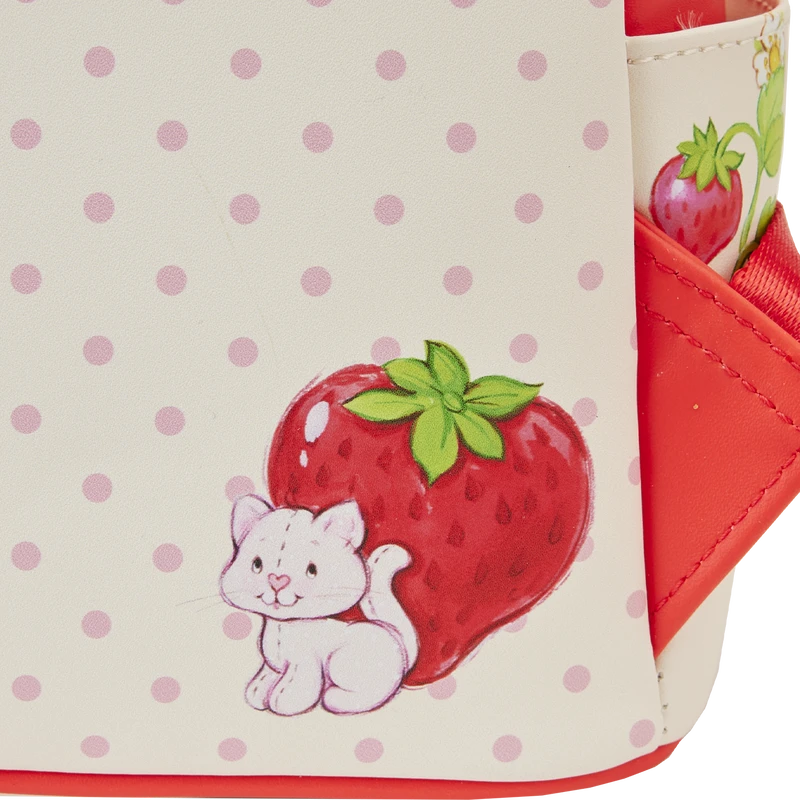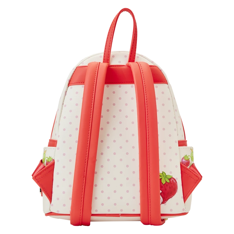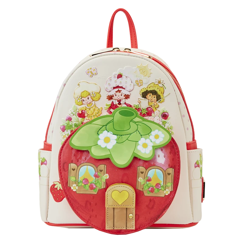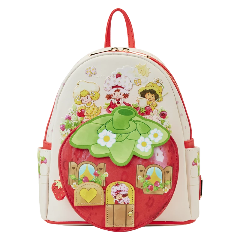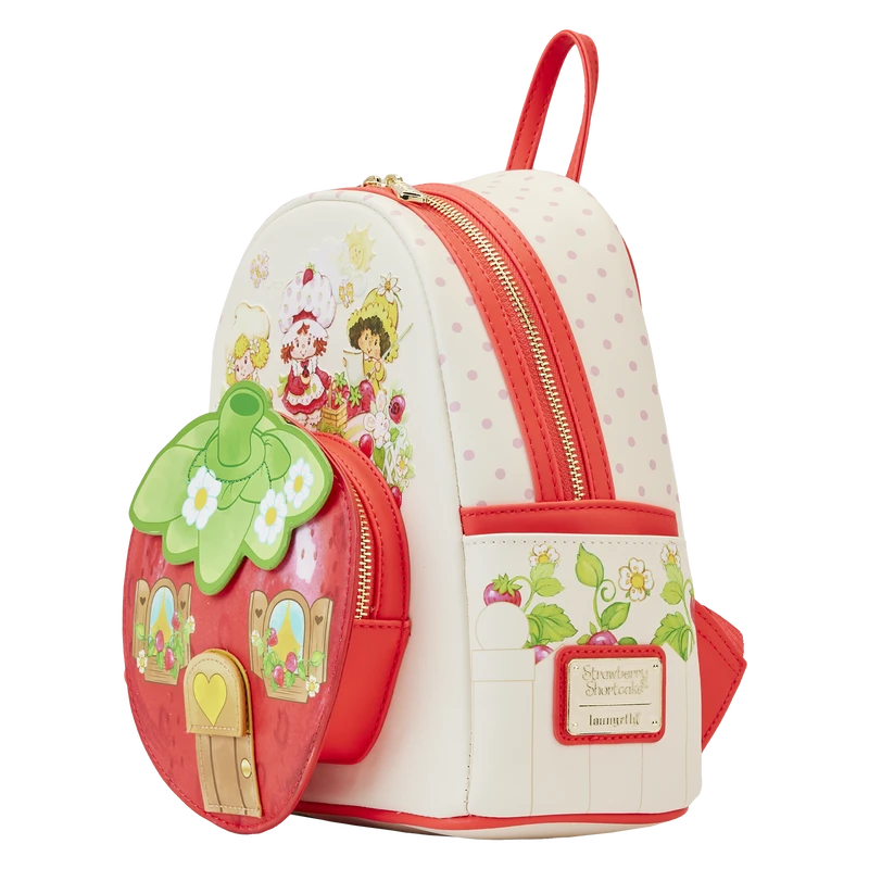 So berry fun! Enter Strawberryland™ in style with our Loungefly Strawberry Shortcake Strawberry House Mini Backpack. The front pocket of this backpack is strawberry shaped—with berry extra special details. The top part of the door has a hinge so that you can open it to reveal Strawberry Shortcake with her pet, Custard, inside. A rubber-molded charm, in the shape of a strawberry, tops off the look. Above the figural pocket, you’ll find Strawberry Shortcake, Lemon Meringue, and Orange Blossom among the strawberry plants. An all-over-print of pastel polka dots carries over to the back, where Strawberry Shortcake and Custard make an encore appearance. The aroma of strawberries just might follow you everywhere you go, as this bag is scented as well! It’s the perfect accessory for a trip to the berry farm— or for turning everyday outings into sweet adventures.