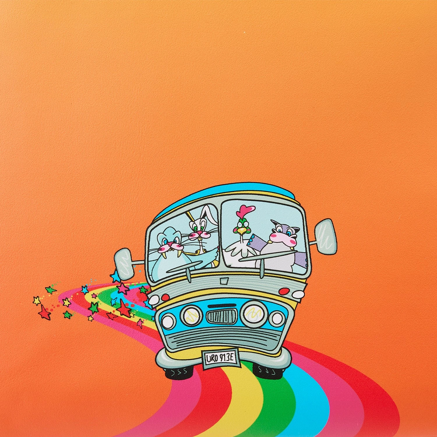 Pack your bags, we’re going on tour! The Beatles Magical Mystery Tour Bus Mini Backpack brings a surreal adventure to life. On the front, a yellow bus takes shape on the zipper pocket as it travels along a colorful road. Turn the bag in the light to see the lenticular back windows shift between The Beatles logo and the band’s animal personas as seen in the “I Am the Walrus” music video. Look closely and you’ll see stars appear in the tailpipe as an enamel zipper charm! On the back, you’ll see the front of the bus appear as it travels to its next fantasy-filled destination. A psychedelic addition to any outfit, this eccentric accessory is perfect for fans looking to keep some of their favorite artists close.