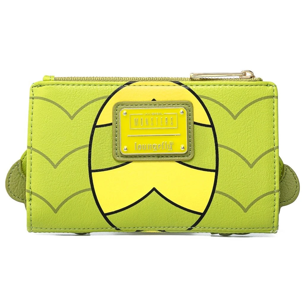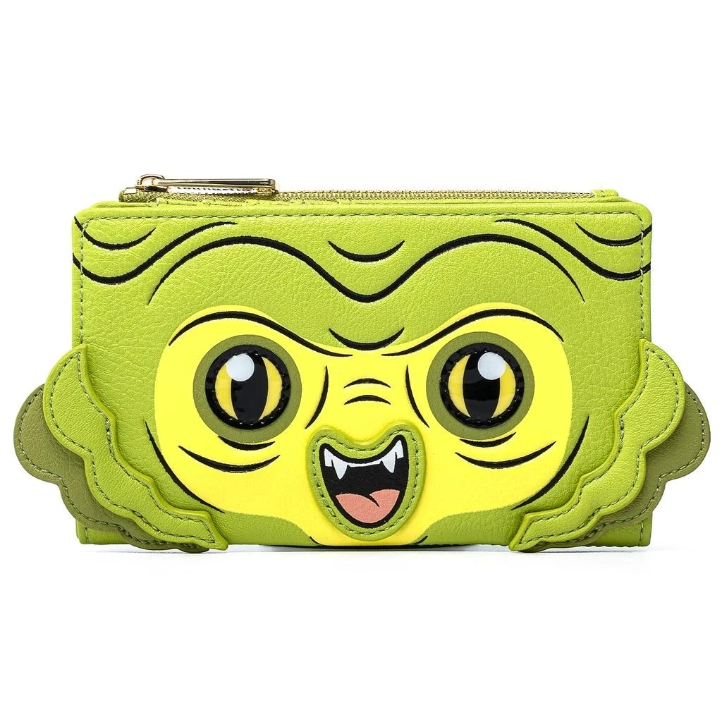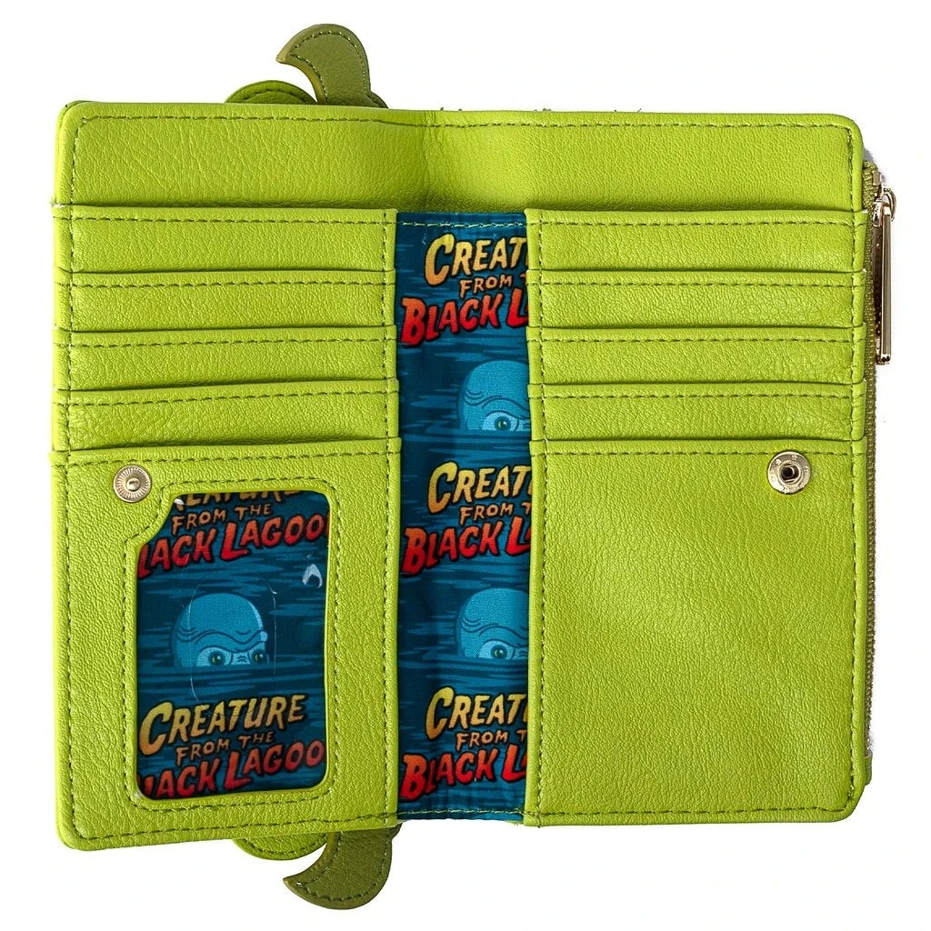 This faux leather wallet features exterior appliqué and embroidered details, interior lining with an allover element symbols pattern.