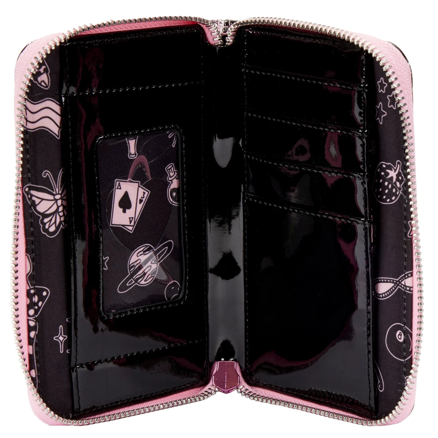 Wallet zips closed. Other features include four slots for cards, a clear slot for holding your ID (which also includes a heart-shaped die-cut detail), pink metal hardwar, vegan leather (polyurethane), and pink topstitch and print details. Note the coordinating lining. Please note: Patterns will vary with all-over-print styles. Not every piece will look identical nor will every piece be an exact match as to what is pictured online.