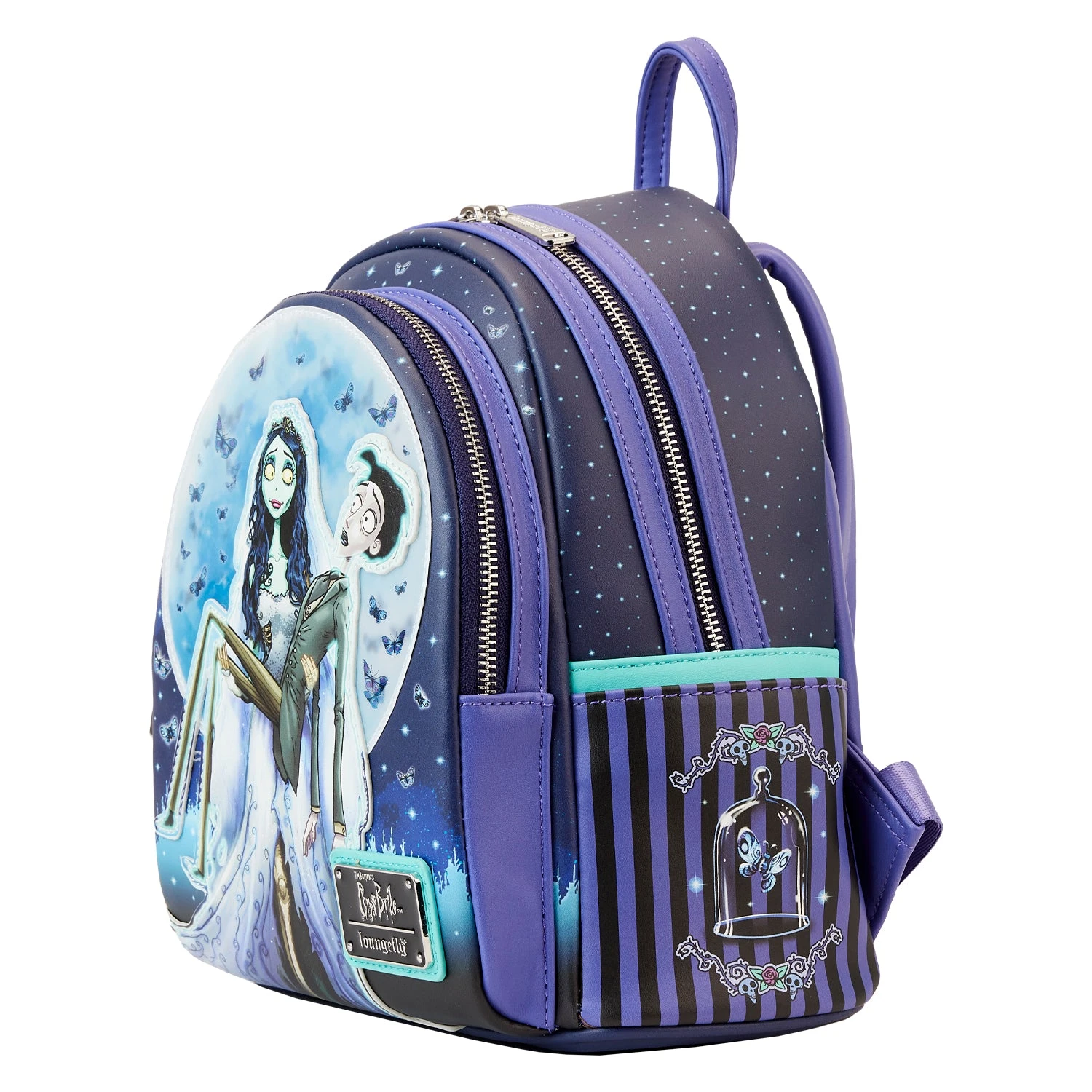 The Loungefly Warner Bros. Corpse Bride Moon Mini Backpack is made of vegan leather (polyurethane). Bag has adjustable shoulder straps and silver-colored metal hardware. Additional features include applique, debossed, lenticular, and printed details. Take note of the coordinating inside lining.